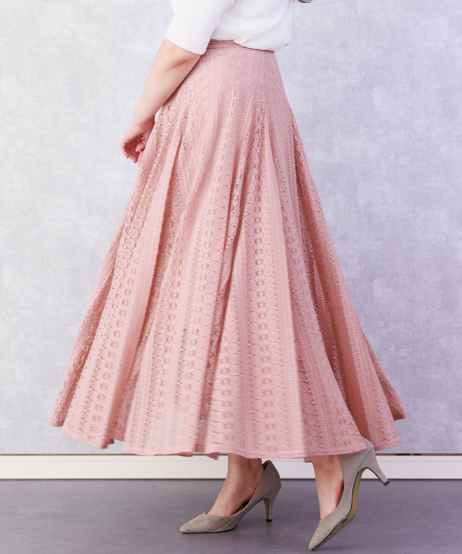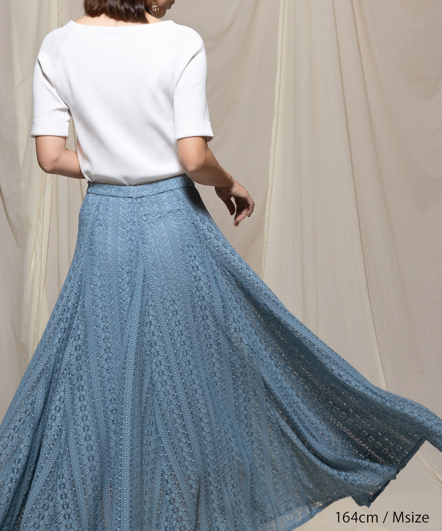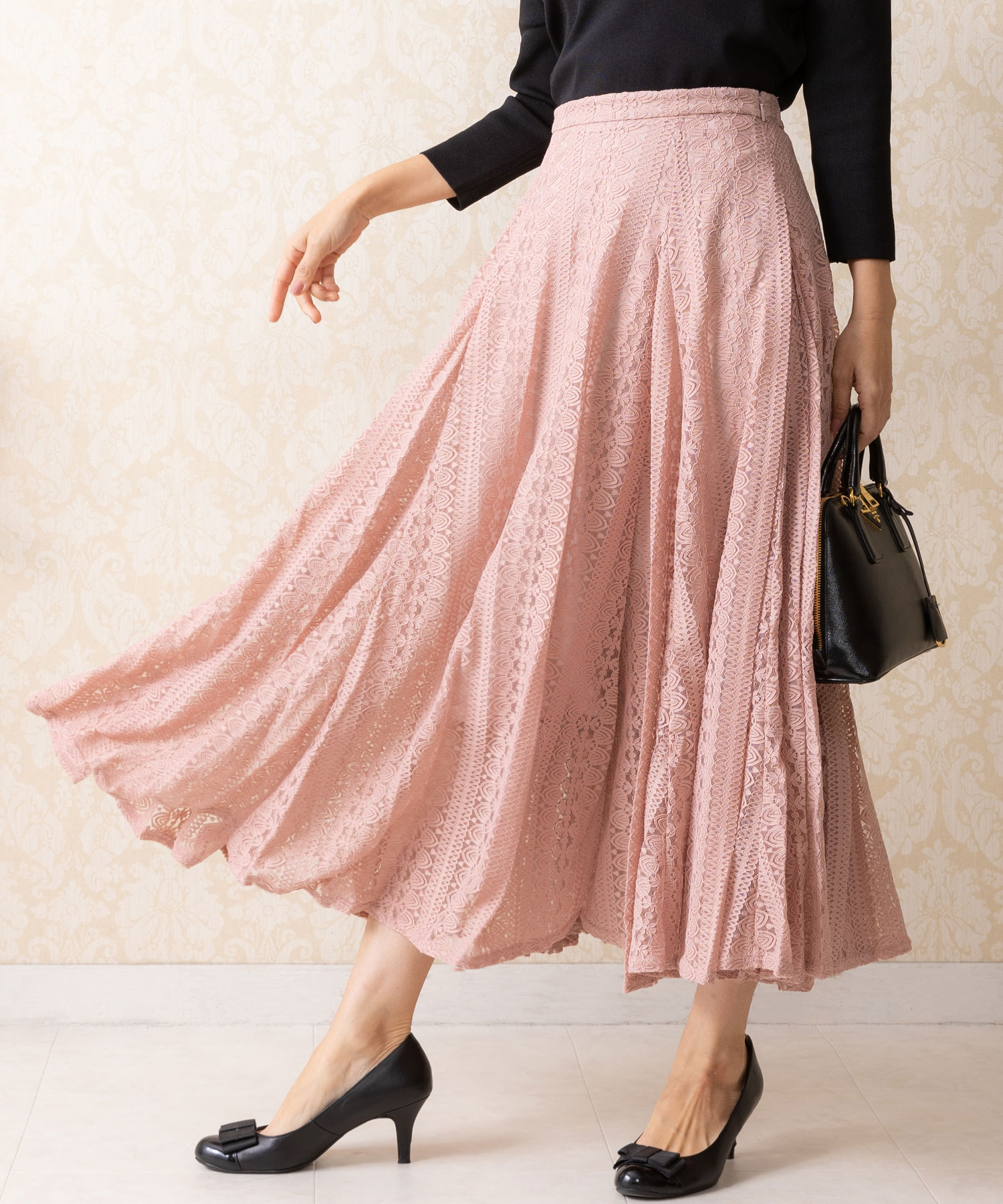たっぷりのレースが歩くたびに揺れ、気品溢れる女性らしさを演出するフレアスカート。 落ち着きのある丈感が、品の良さを感じさせます。 普段のコーデを印象的にブラッシュアップさせ視線を一人占めにする手放せない1着です。