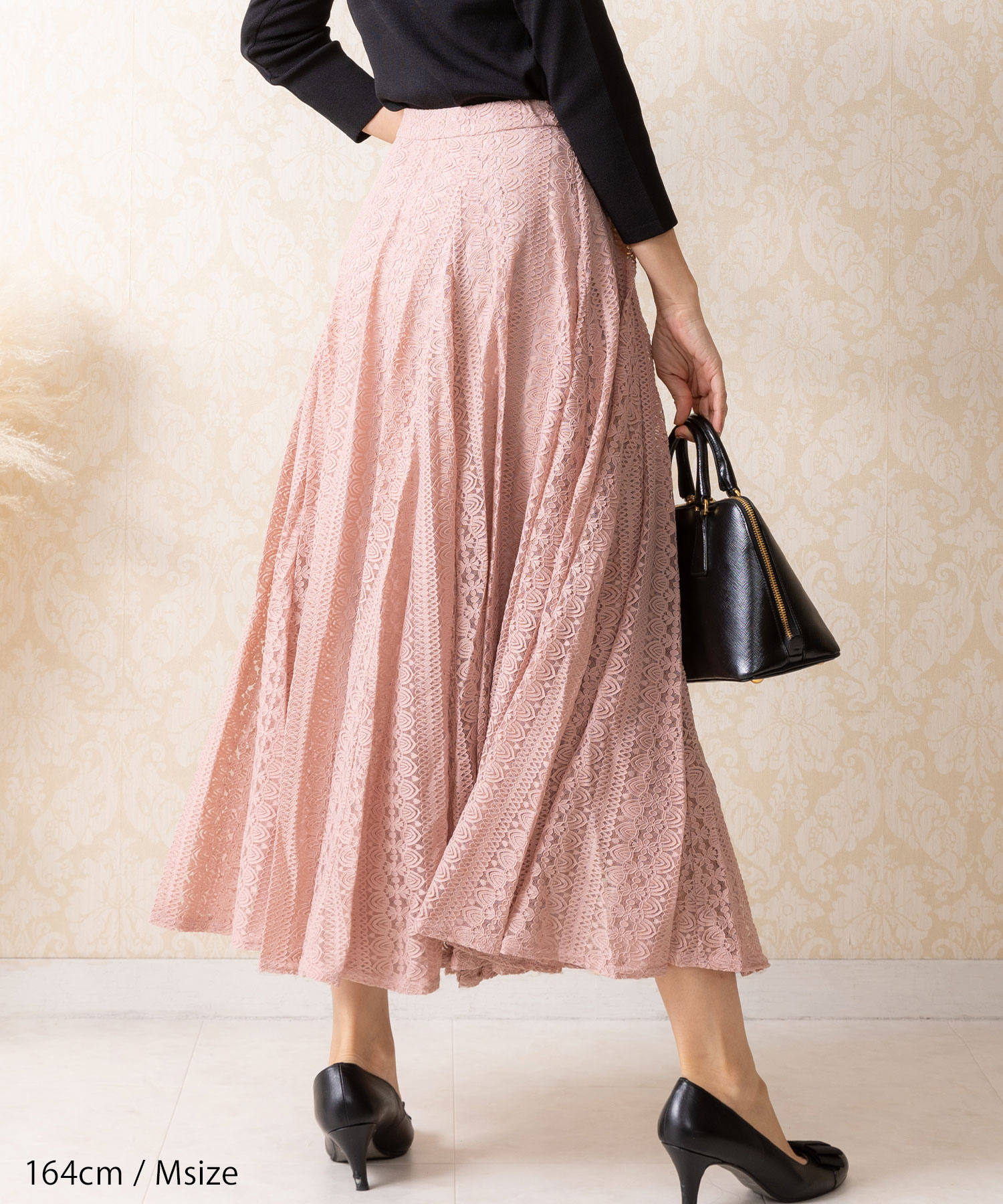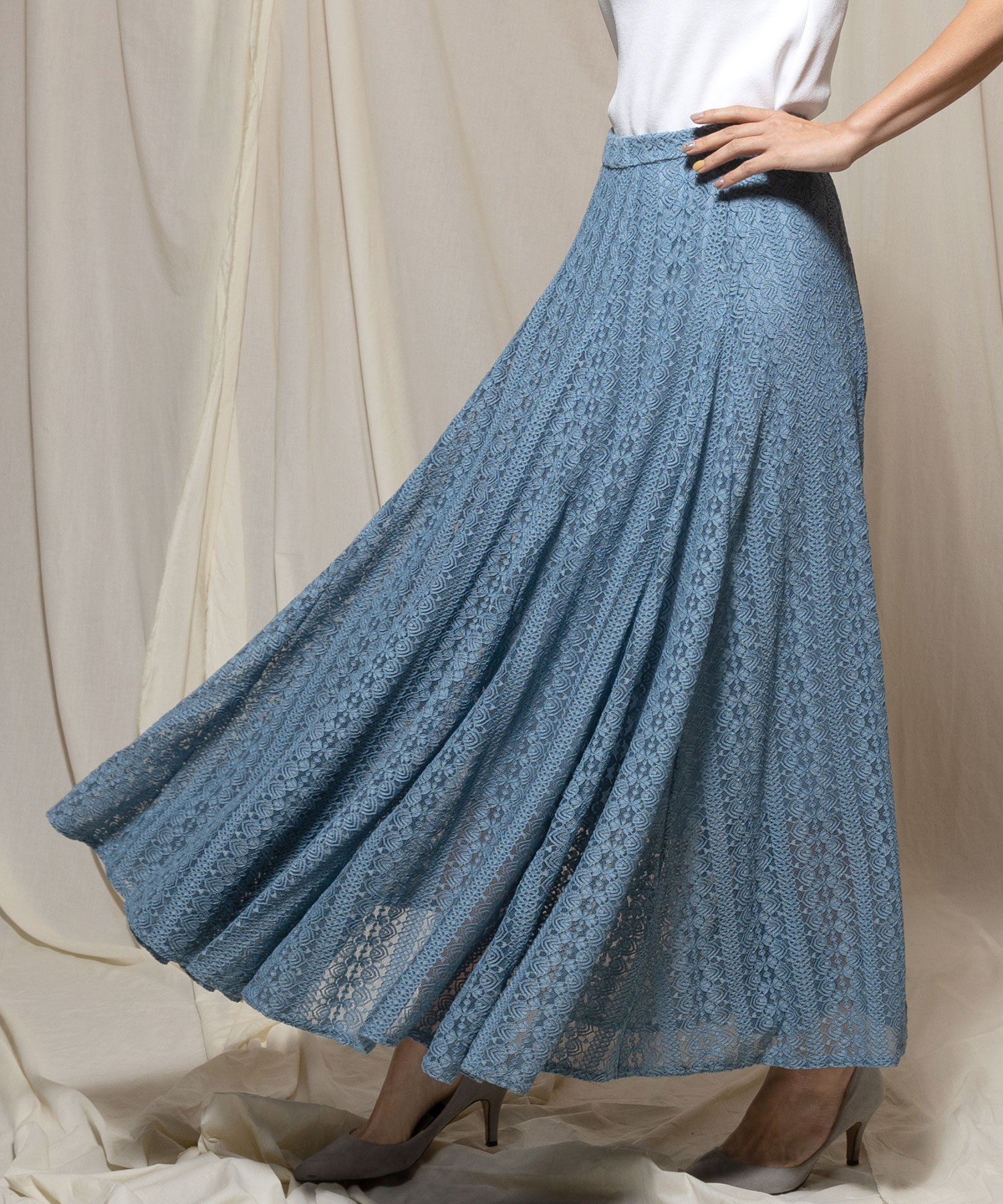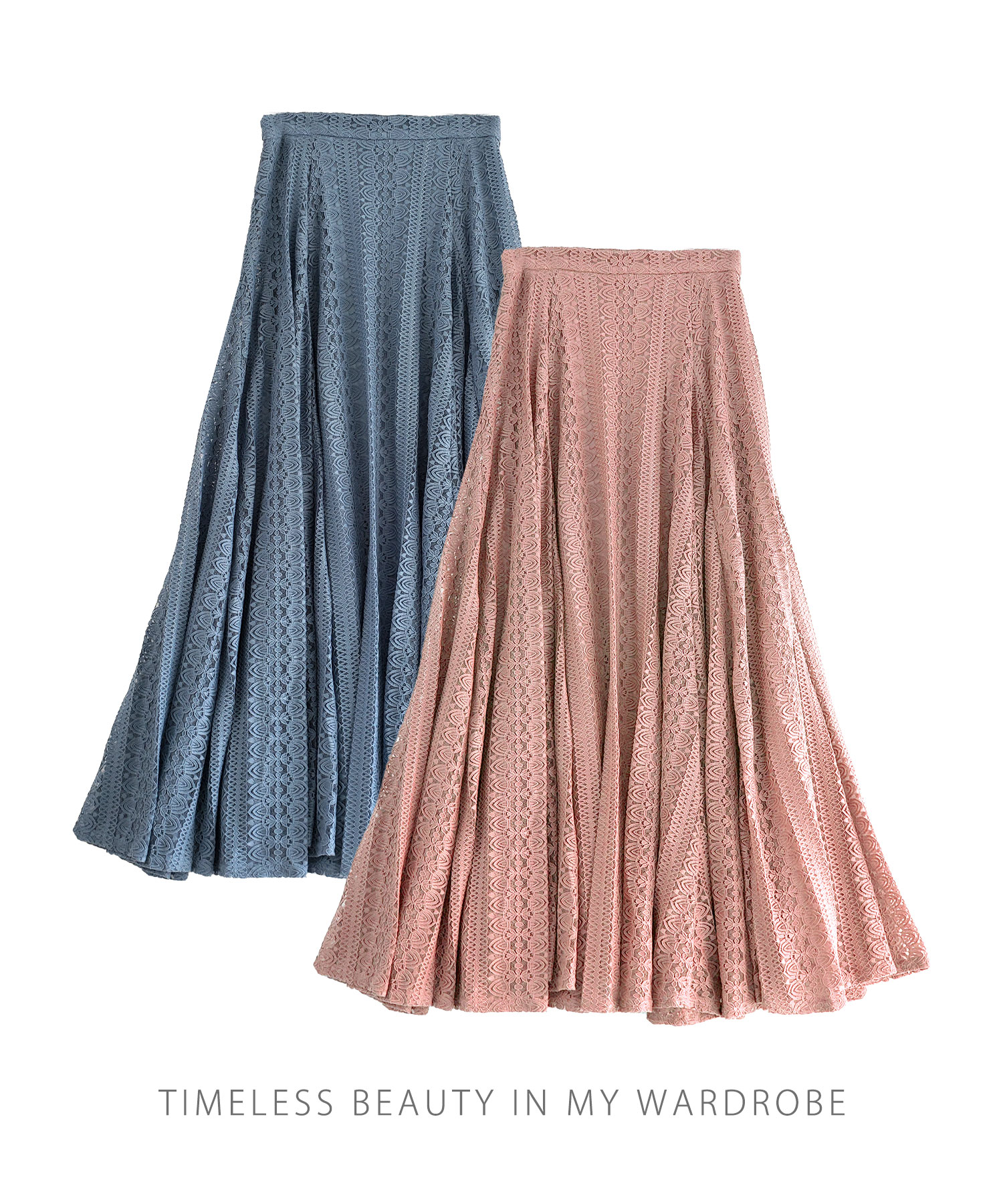 たっぷりのレースが歩くたびに揺れ、気品溢れる女性らしさを演出するフレアスカート。 落ち着きのある丈感が、品の良さを感じさせます。 普段のコーデを印象的にブラッシュアップさせ視線を一人占めにする手放せない1着です。