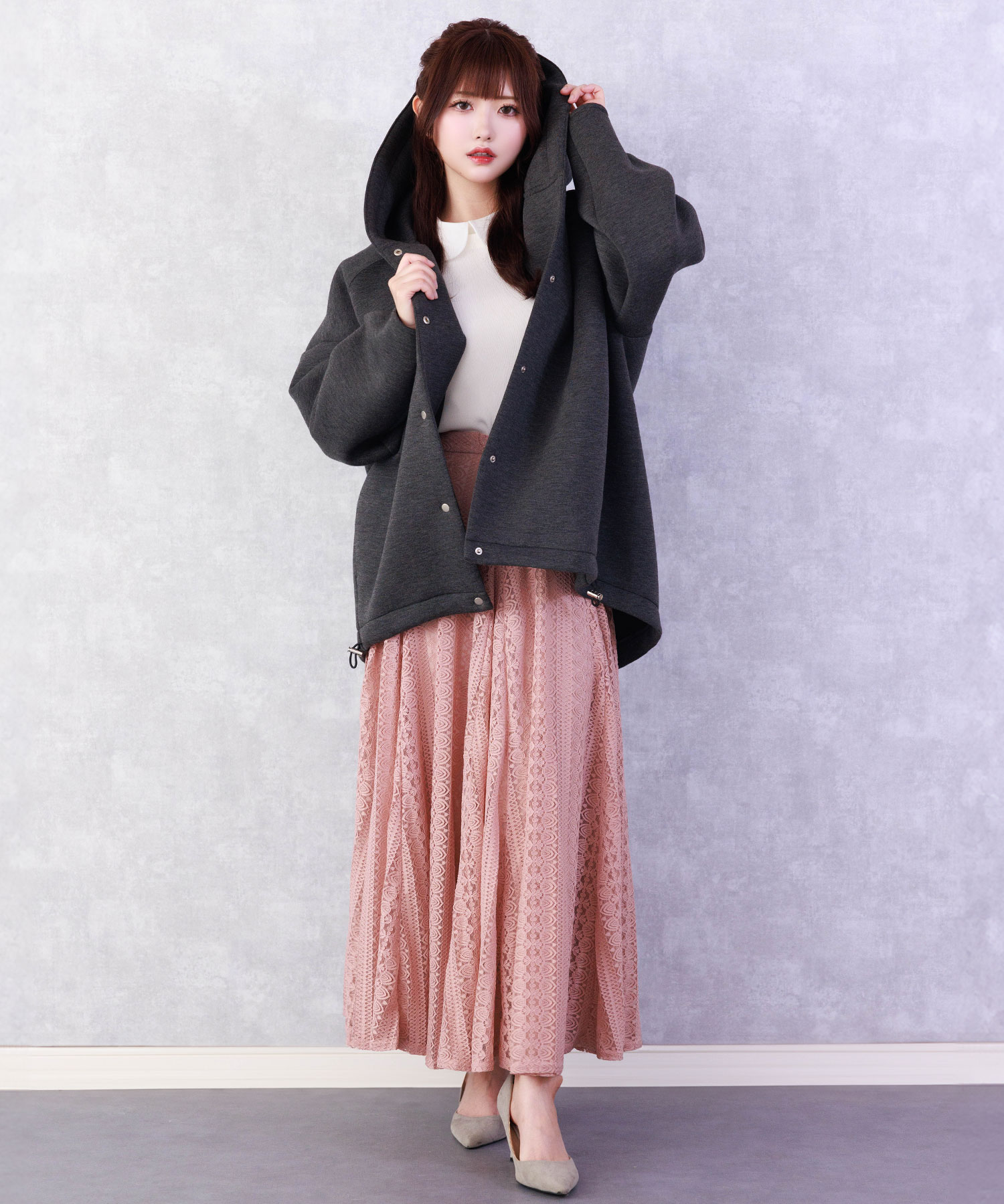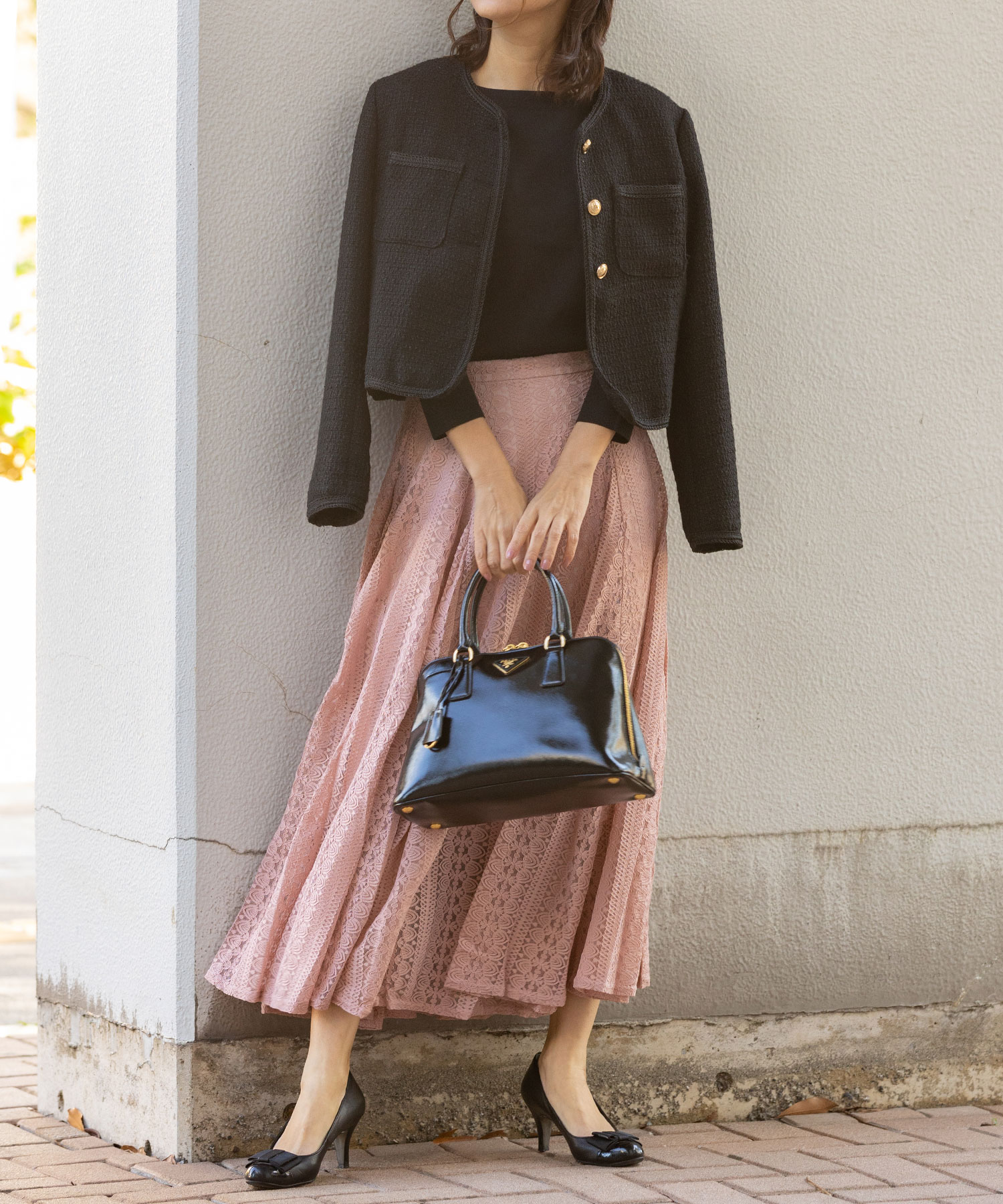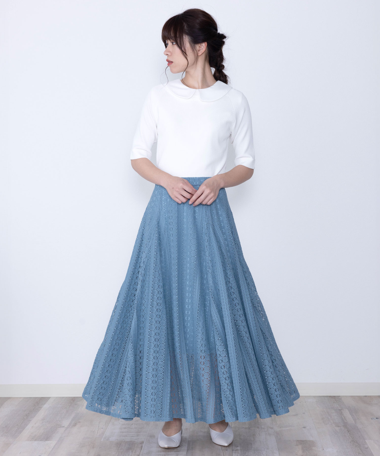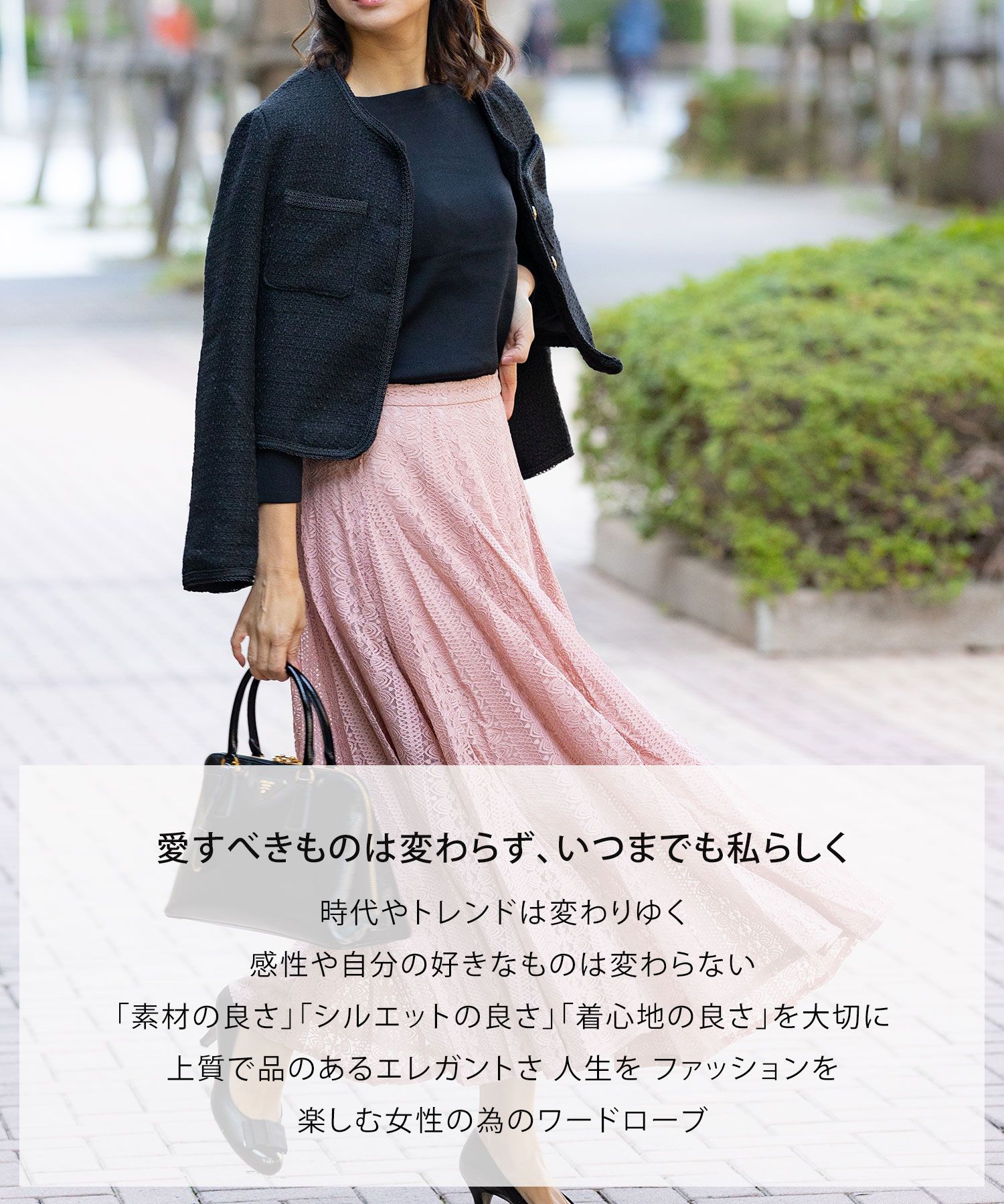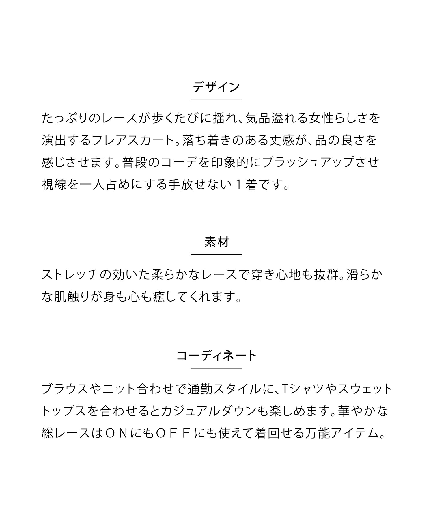 ブラウスやニット合わせで通勤スタイルに、Tシャツやスウェットトップスを合わせるとカジュアルダウンも楽しめます。 華やかな総レースはONにもOFFにも使えて着回せる万能アイテム。