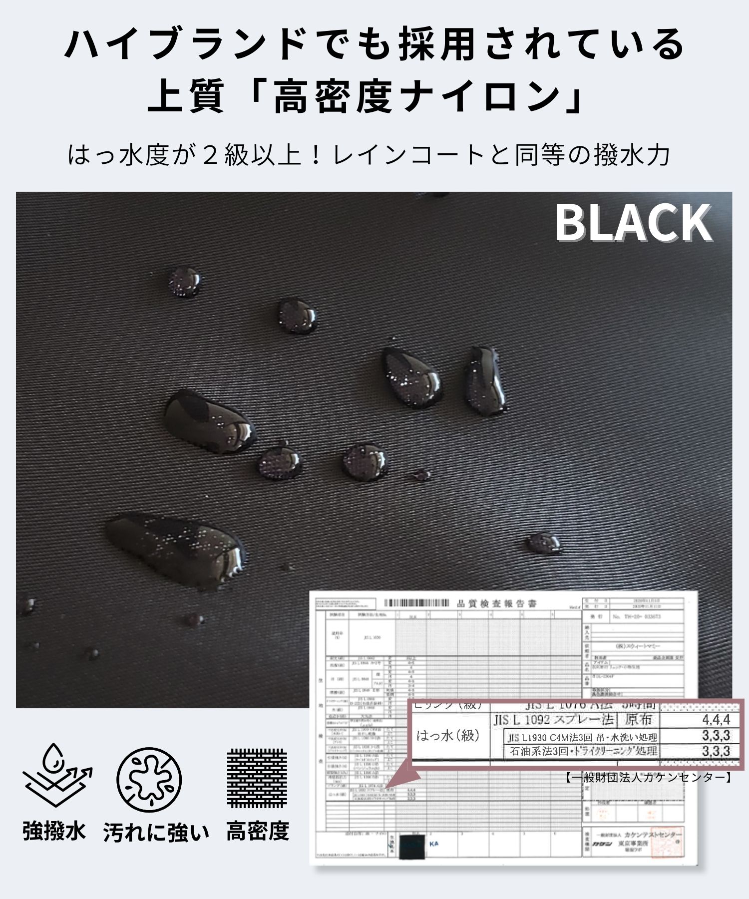 【ブラック】強撥水ナイロンは、レインコート級の撥水力で丈夫で汚れに強くお手入れが楽なのが特徴です。