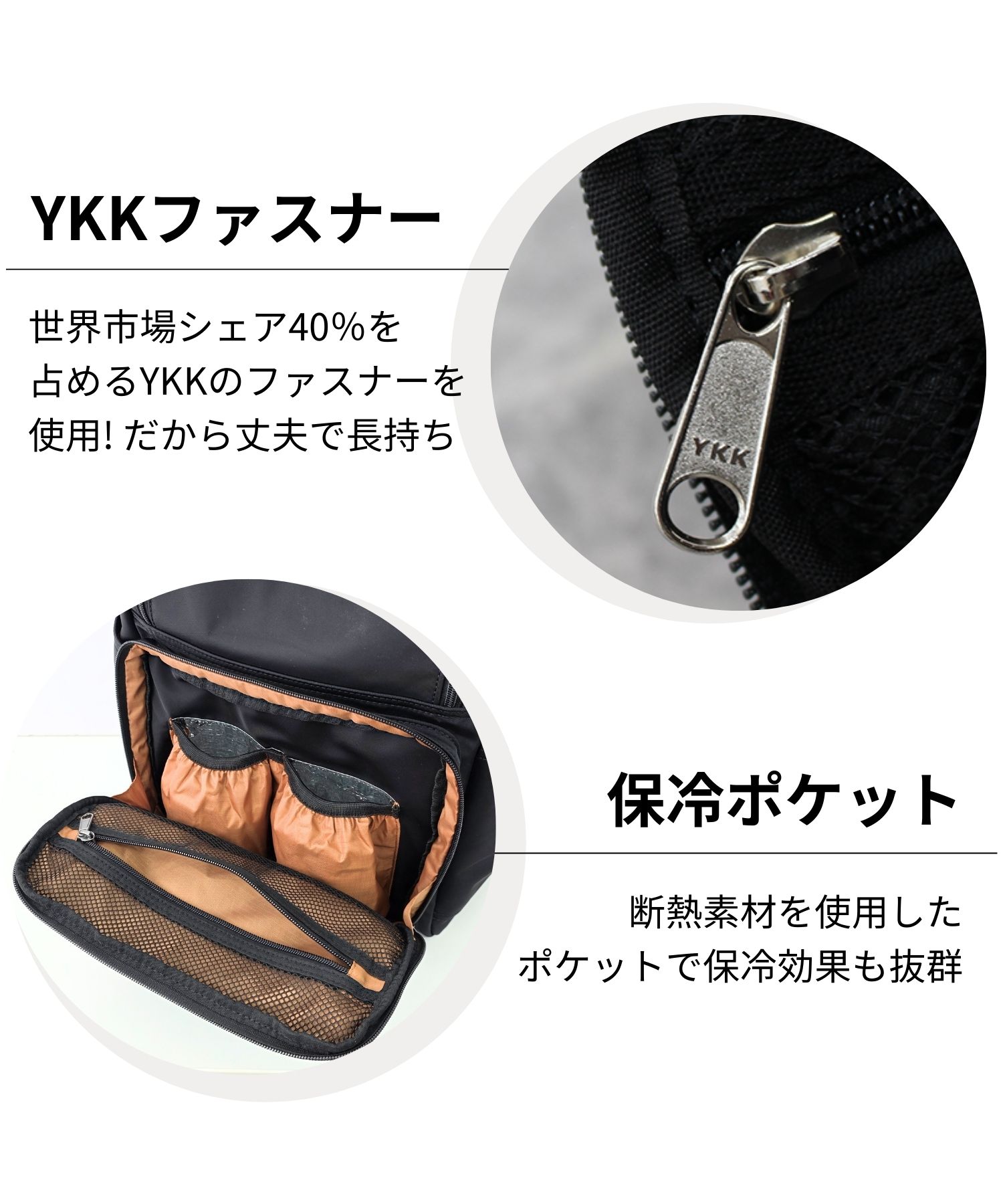 背中ファスナーがついておりリュックを降ろさなくても中身が取り出せて快適。ベビーカーフック付きで、おでかけ中もママの負担が減りストレスフリーです。