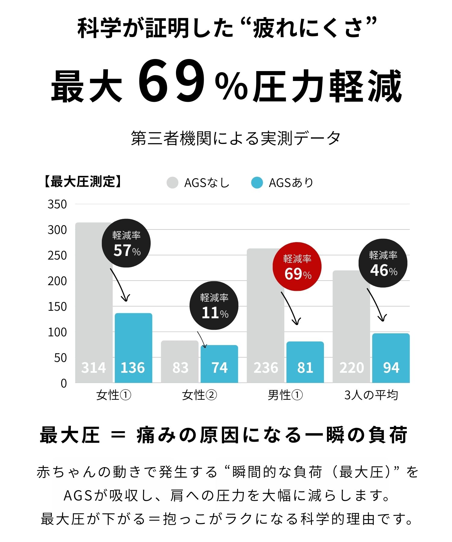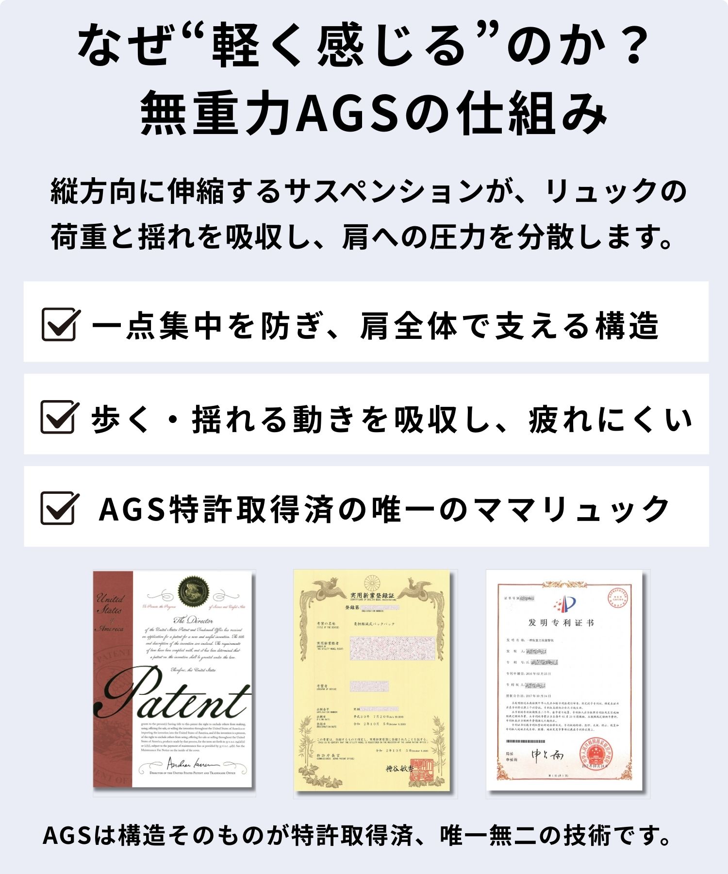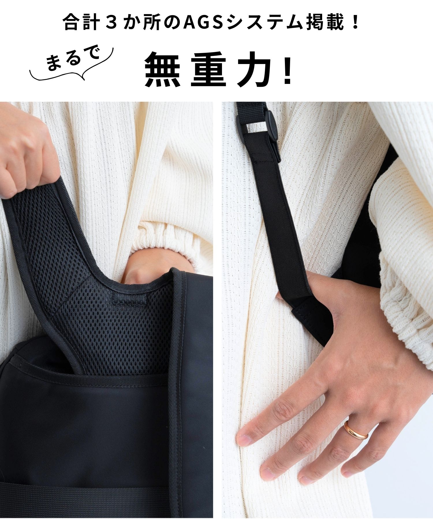 特許技術「AGS」機能搭載!ウルトラバウンスと呼ばれる伸縮性の高い特殊ゴムベルトがバネのように働き、歩くたびに肩の負担を軽減!身体に掛かる負担を最大69%軽減します。