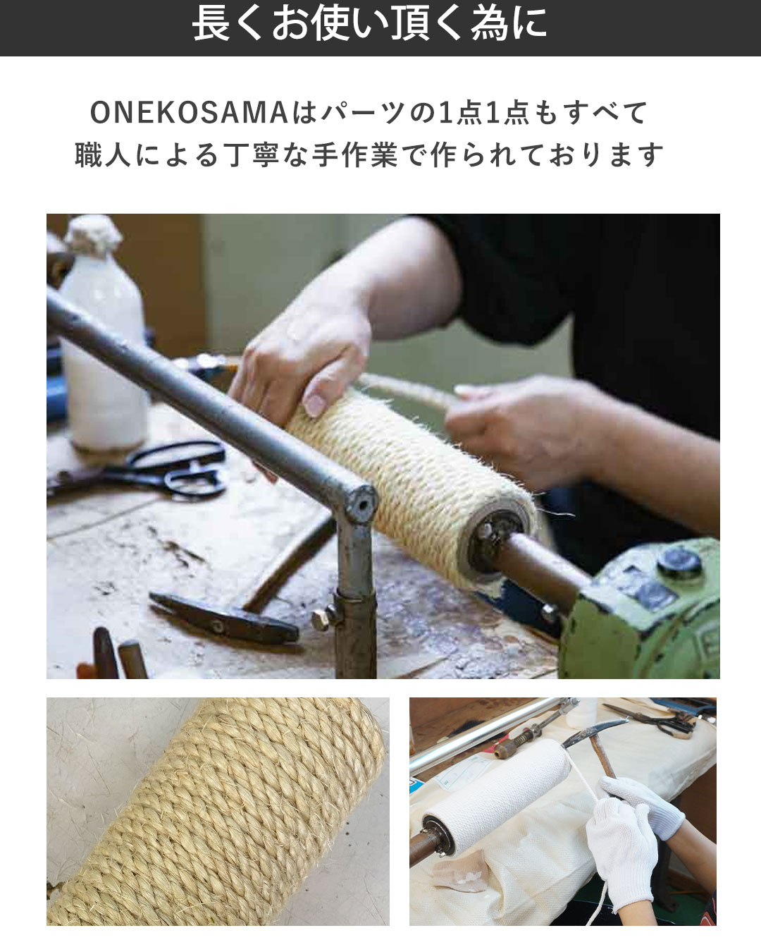 長く使ってほしいから。ONEKOAMAキャットタワーは、すべての交換パーツをご用意しております。 たくさん遊んで、傷だらけになったり、汚れた部分のみの交換が可能。長くお使い頂けます。