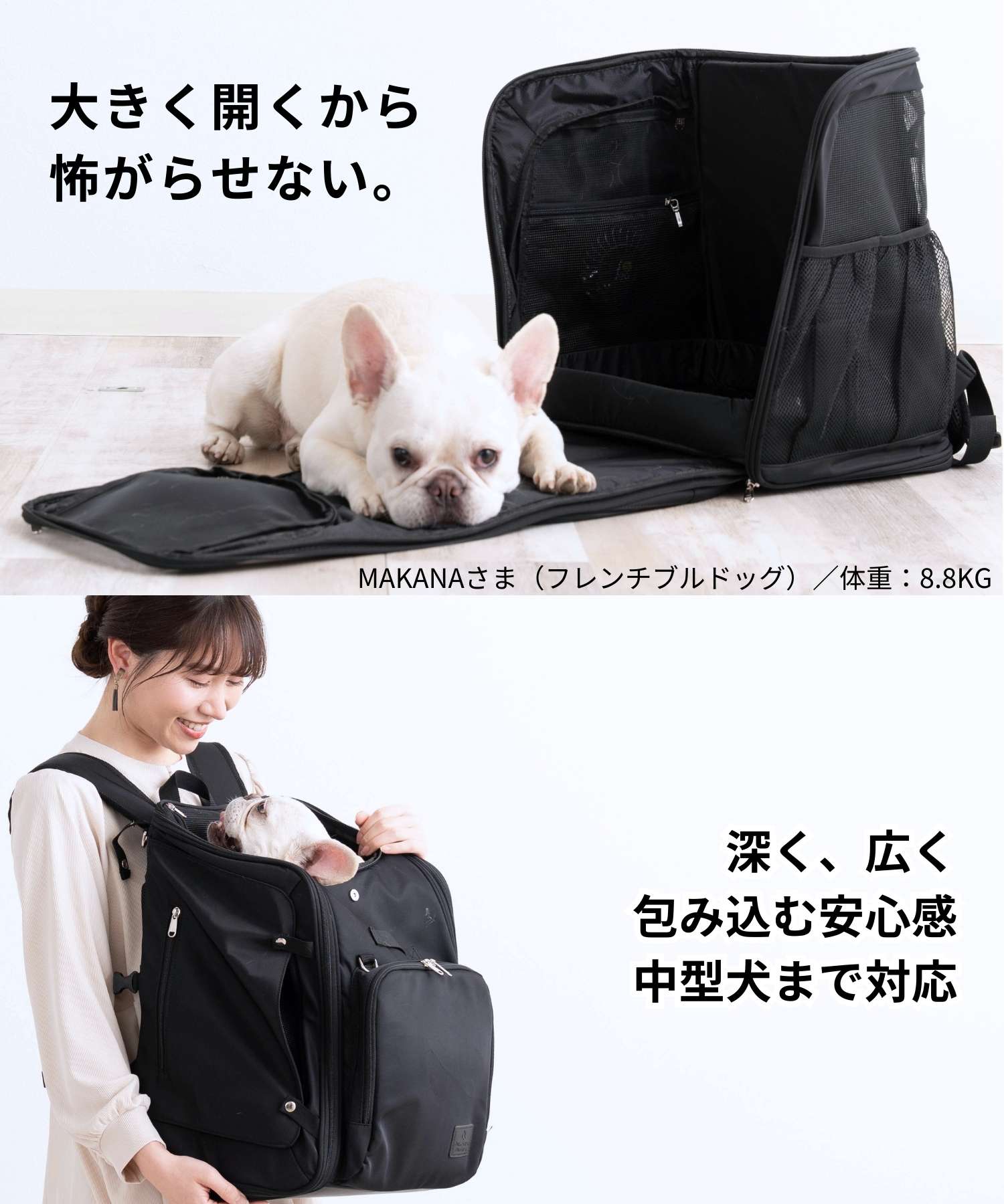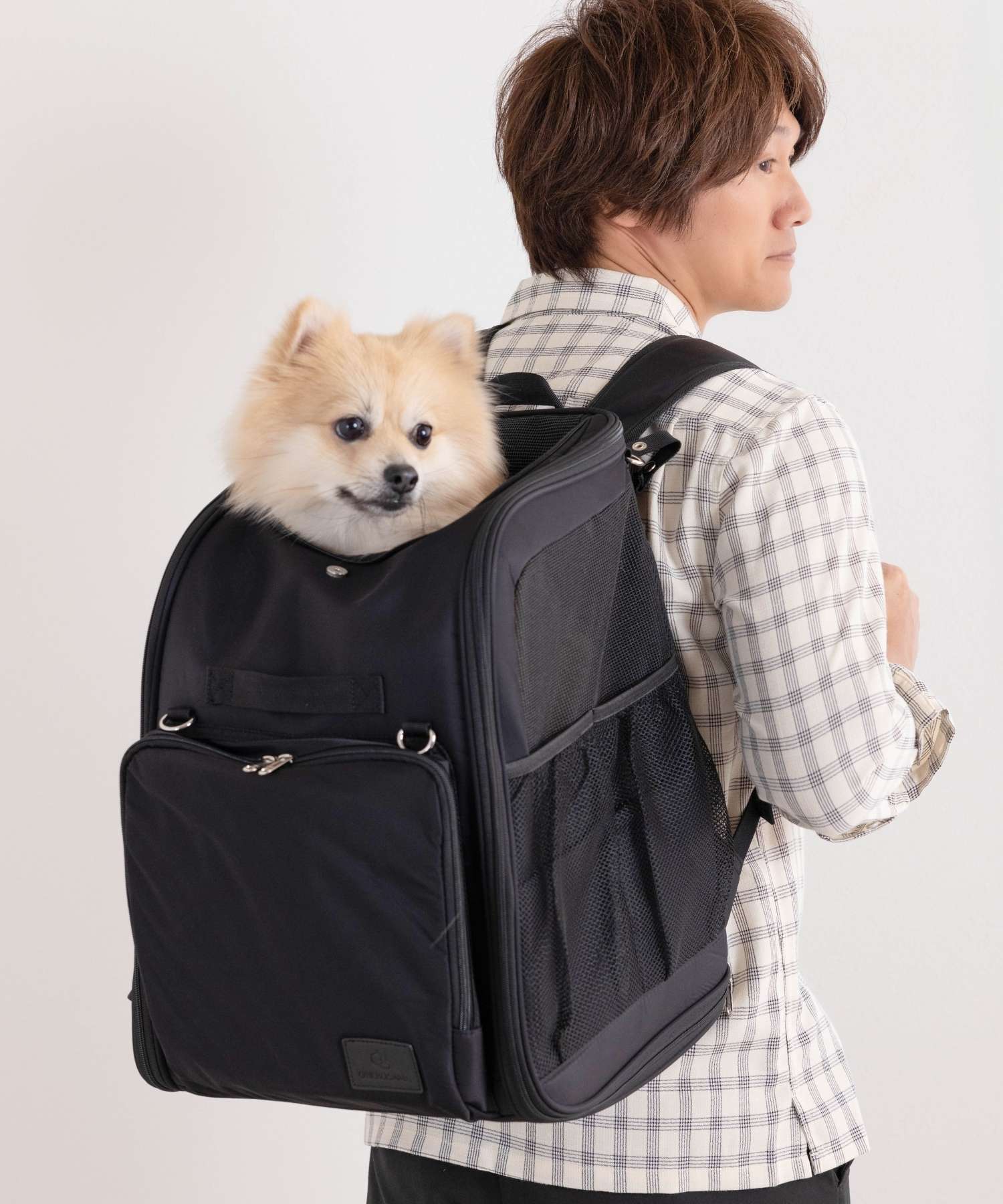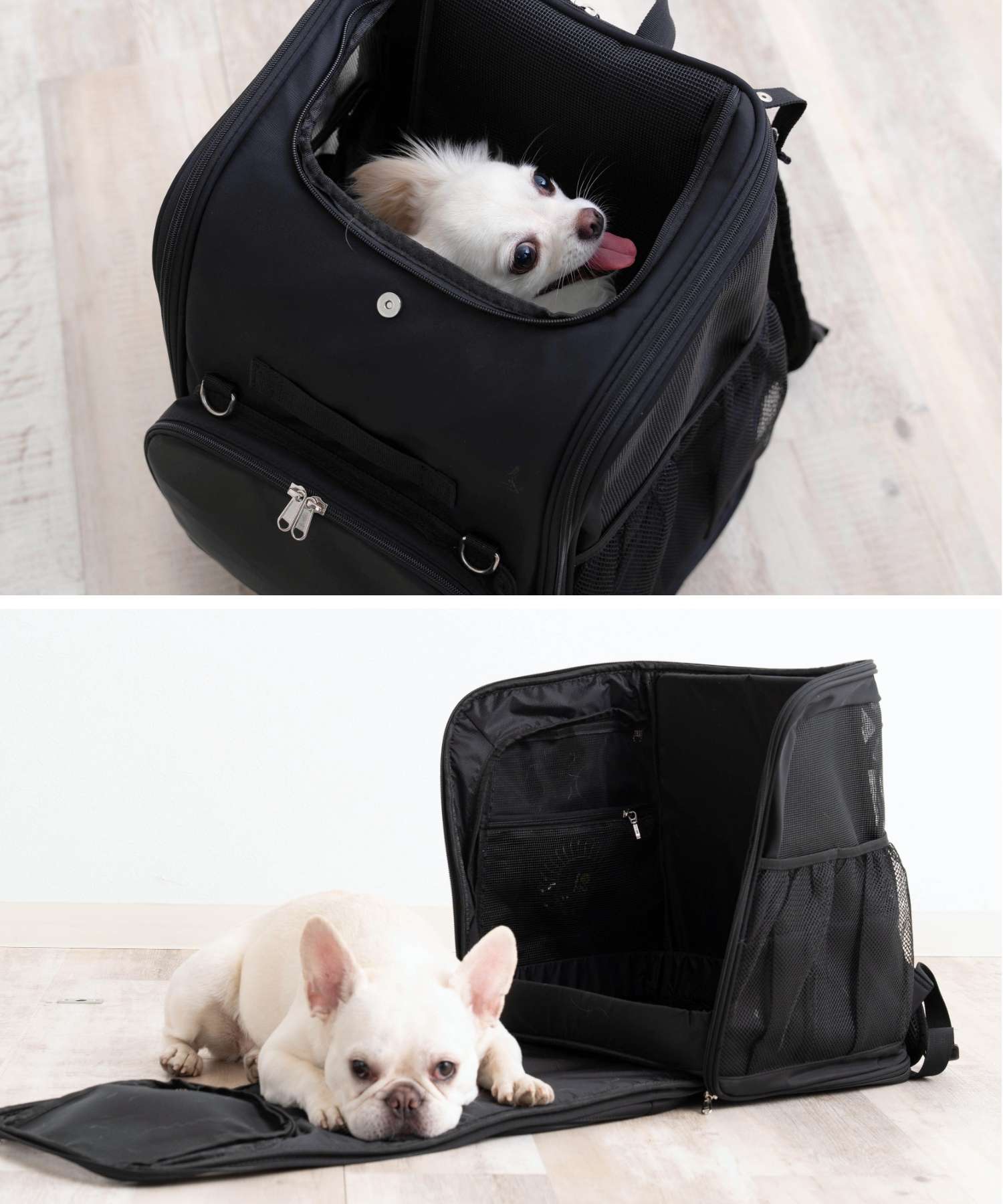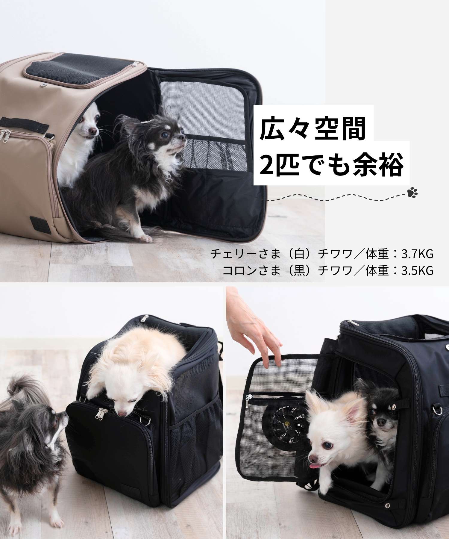 チワワ(3.9キロ)には、十分な広さで、メッシュの窓もあり夏場も使いやすそうです。車内使用時にシートベルトも背面に通せそうです。