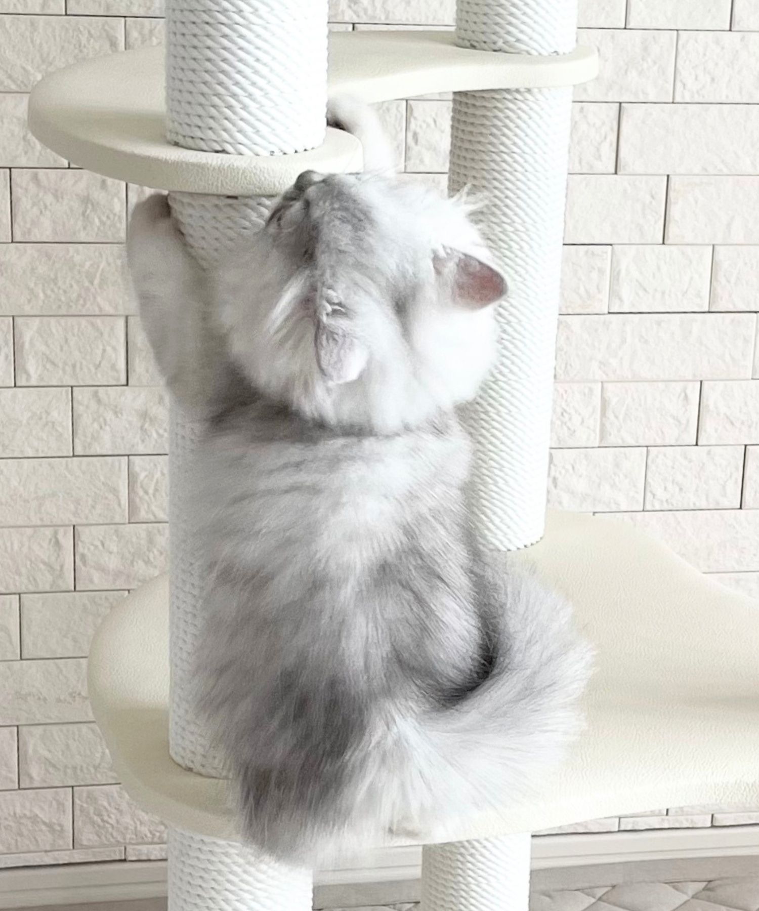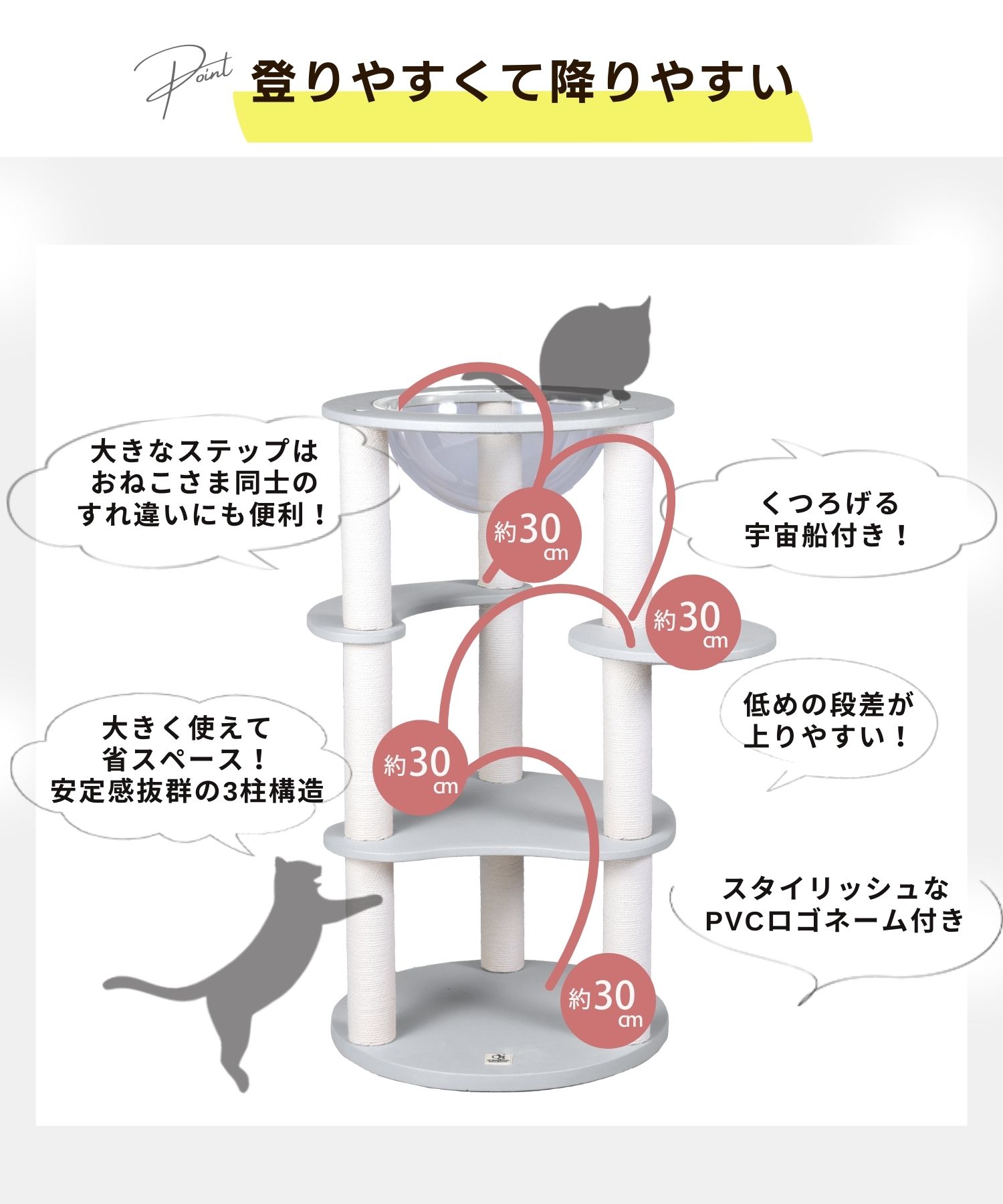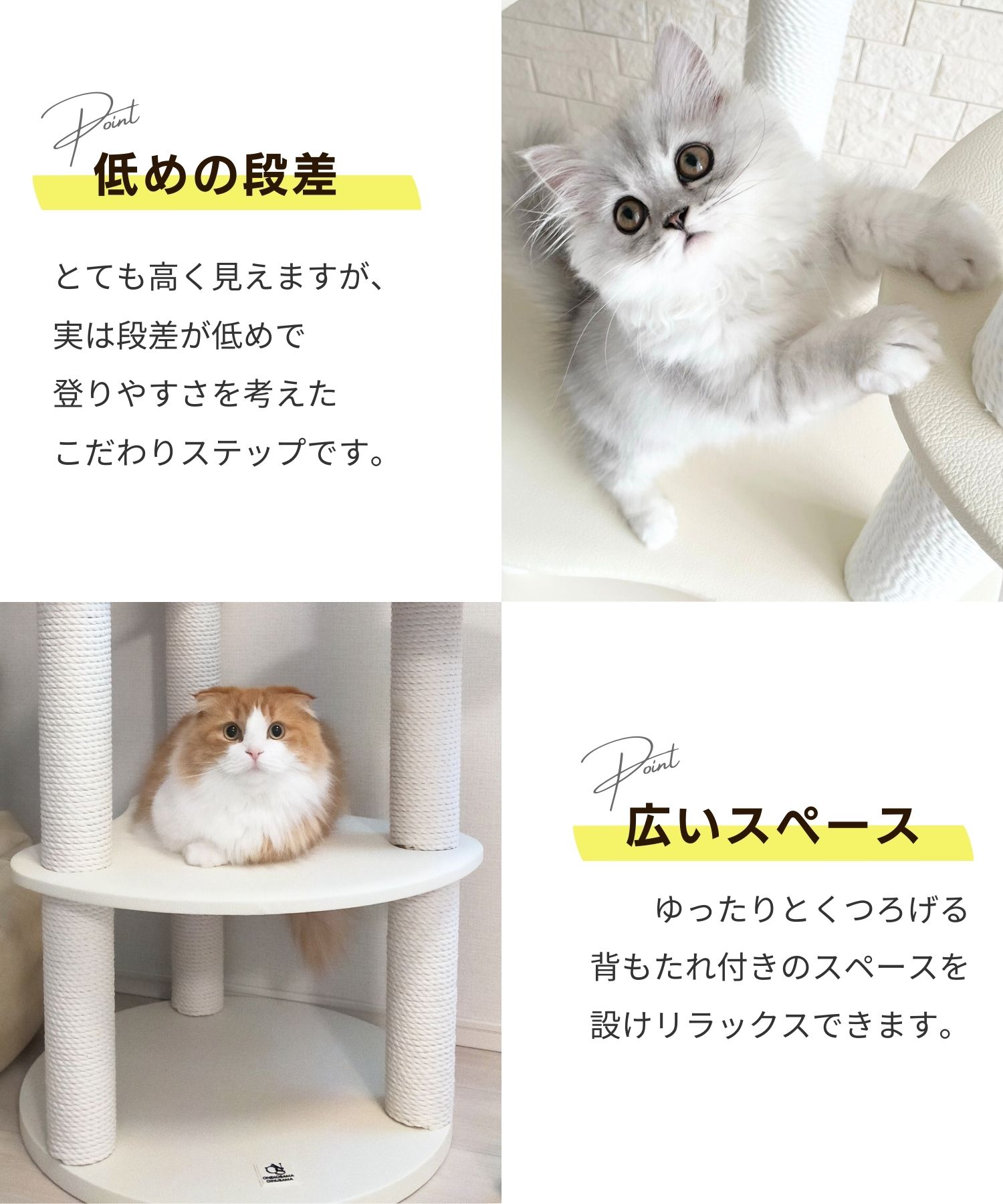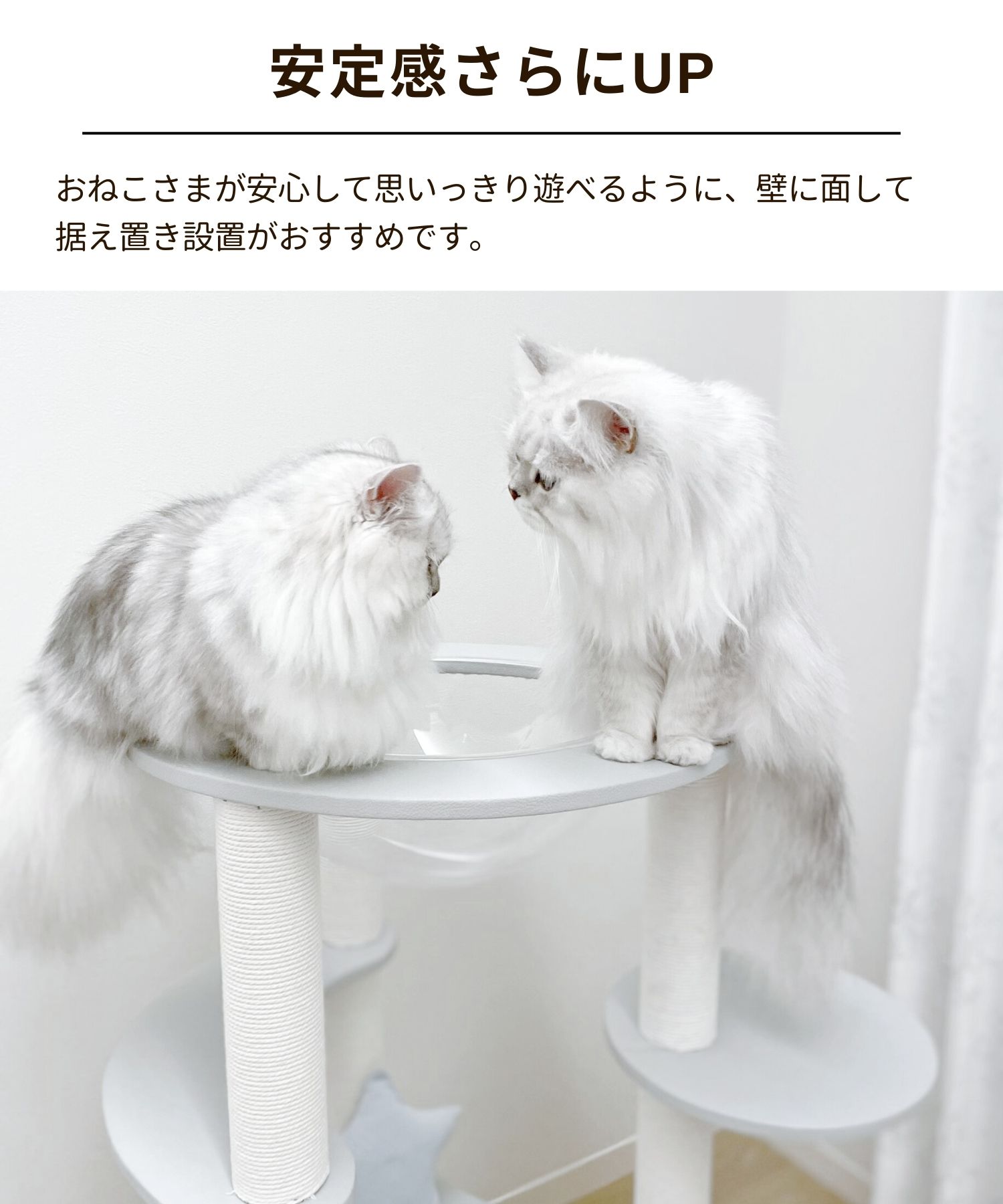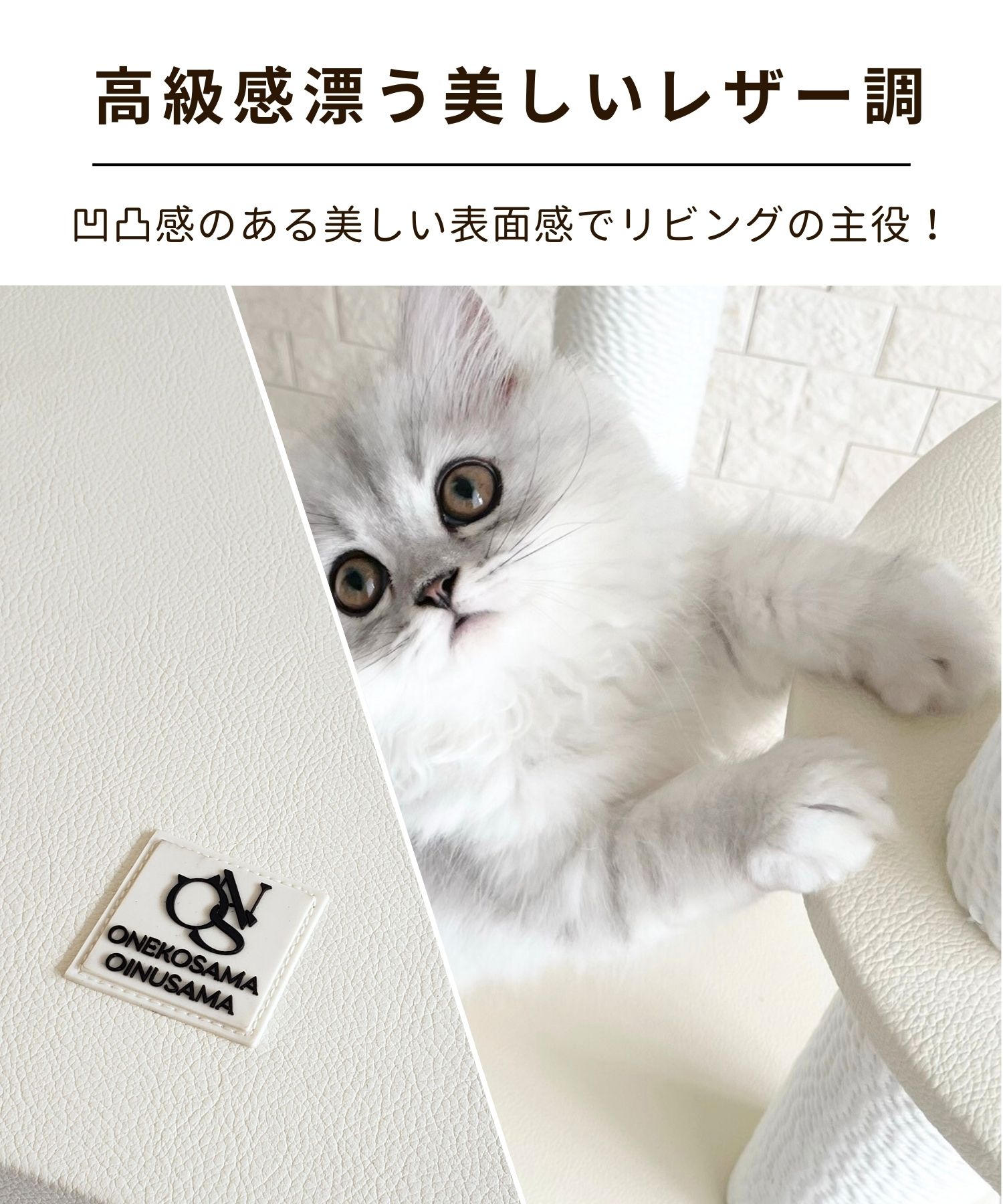 愛猫との距離がさらに近づくキャットタワー。 少し低めのサイズなので、ソファ脇で一緒にテレビを見たり、ベッド脇に置いて近くで眠ったり…。 安定感のあるステップがあるので、小さな猫ちゃんや足腰が弱ってきた高齢の猫ちゃんも安心して使うことができます。 レザー調生地で高級感たっぷり! インテリアにも溶け込みおしゃれな印象に。