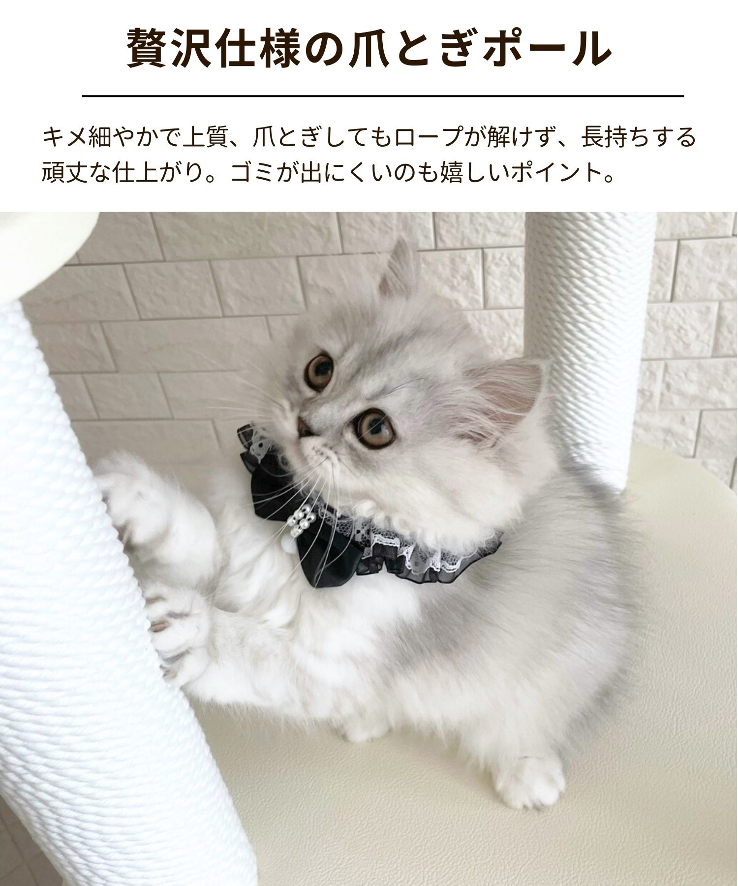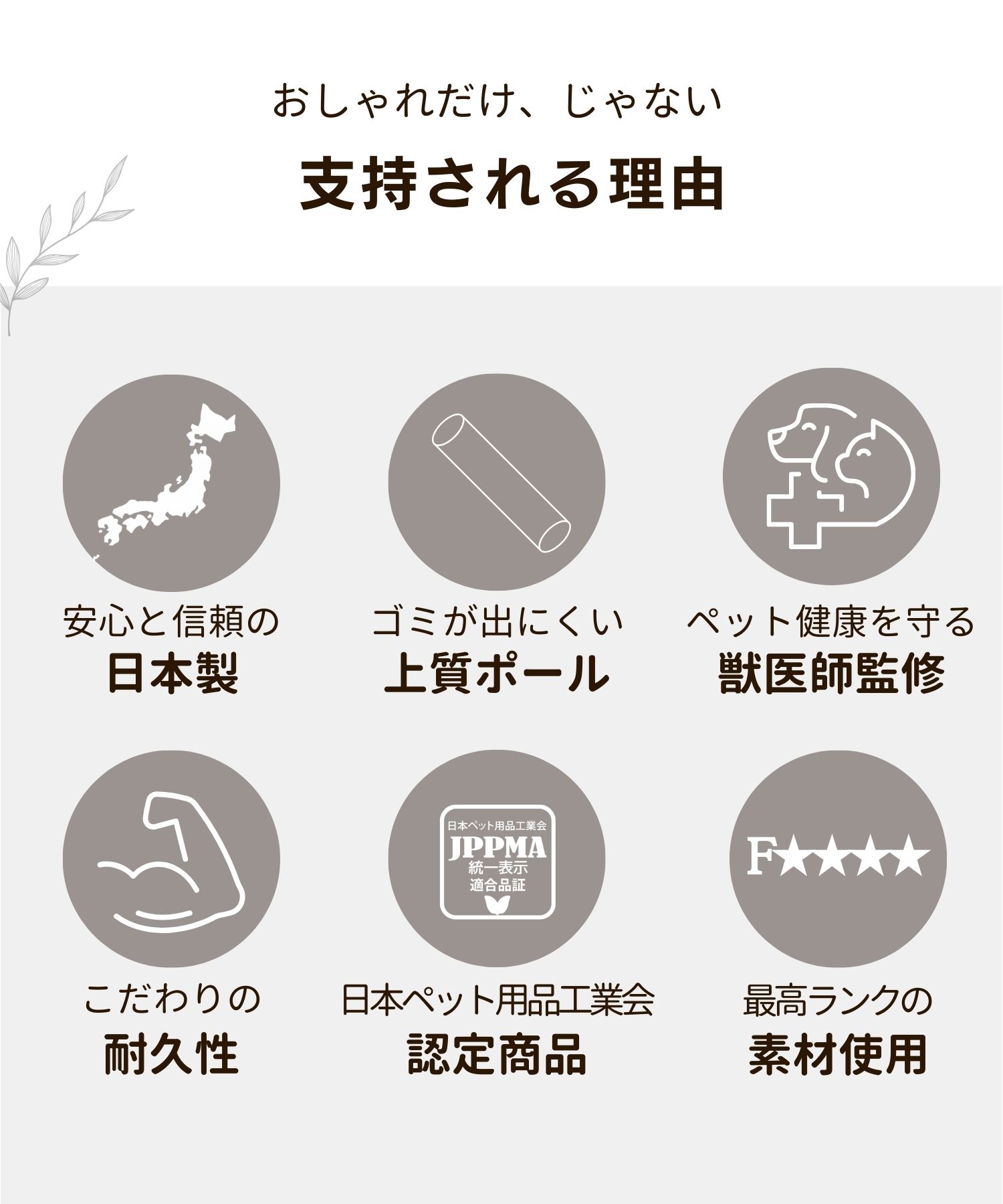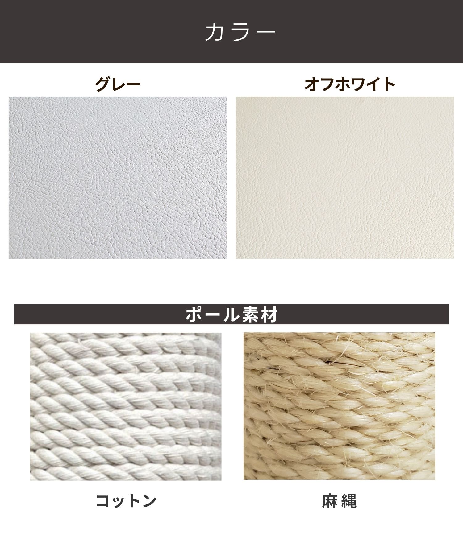 ご購入より6カ月以内に不具合が発覚した場合には、対象部品 を無償でお届けいたします。 但し、以下の場合は保証の対象外となりますのでご注意くださいませ。 ◎組立てミスによる故障・破損 取扱い説明書をしっかりとお読みください。 ◎商品の劣化や消耗による故障・破損 使用による爪とぎポールの消耗や布ポール、ステップ台の生地の摩擦、破れ。 ハンモックの接合部分の耐久の衰えなど。 ◎きちんとした組み立てをせずに生じた故障・破損 組み立てをせずに部品のみで使用した場合など ◎誤った設置場所により生じた故障・破損 水平でなくクッション性のある場所での設置を行ったり、お客様自身でカスタマイズを行った場合など ◎無理な使用により生じた故障・破損 推奨使用頭数を超える場合の使用や、過度な荷重をかけた場合の故障・破損。 ◎遊びによる破損 猫ちゃんが遊んでの生地破れ、ネジの故障・破損等。 ◎ニオイによるもの ニオイが気になる場合は、必ず組み立て前、到着から1週間以内にご連絡ください。 ◎製造過程に発生するもの レザーやフリースの穴あけには熱による工具を使うため、周辺にコゲが残る場合がございます。こちらは不良ではなく正常品範囲となります。あらかじめご了承ください。 ◎季節によるもの 梅雨時期のカビの発生など。