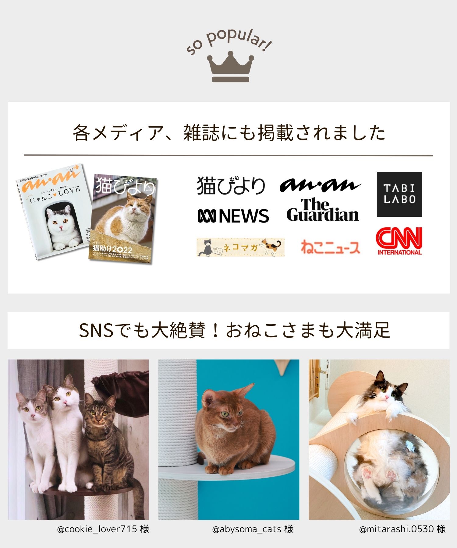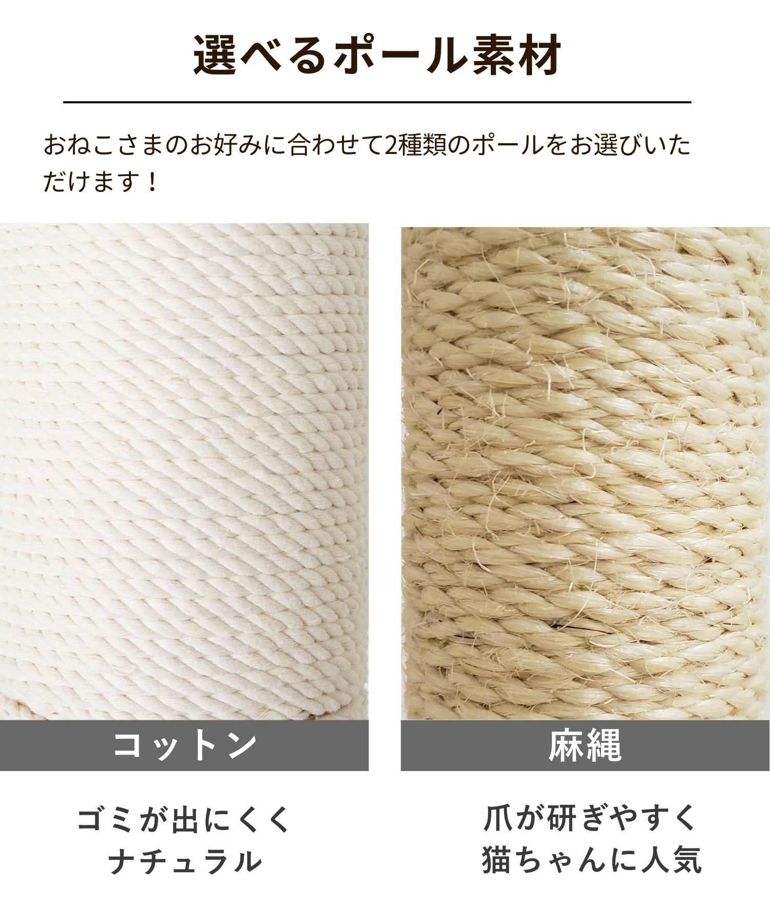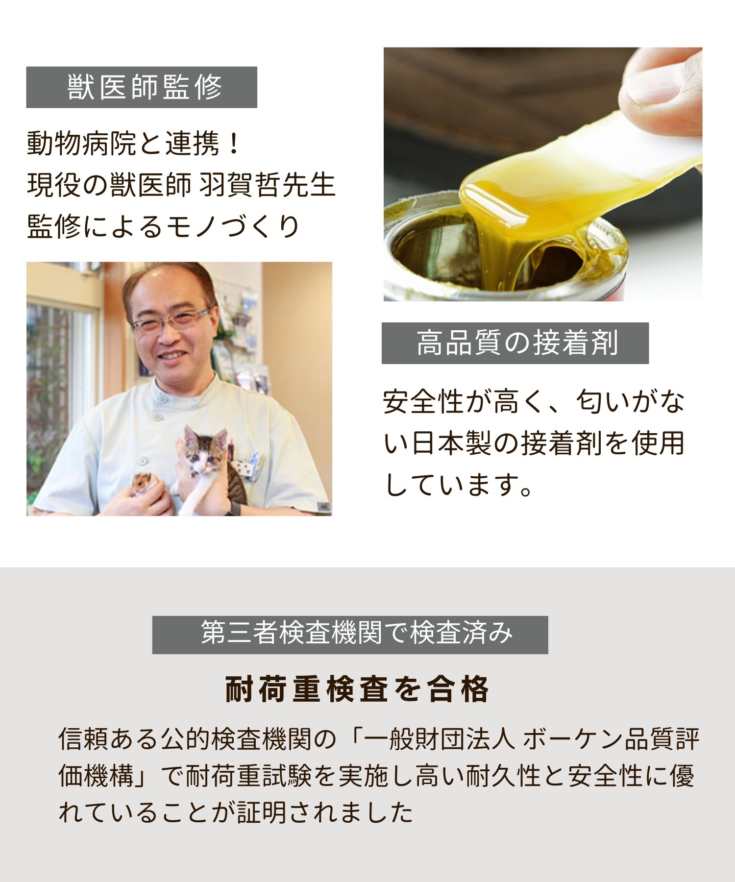 ご購入より6カ月以内に不具合が発覚した場合には、対象部品 を無償でお届けいたします。 但し、以下の場合は保証の対象外となりますのでご注意くださいませ。 ◎組立てミスによる故障・破損 取扱い説明書をしっかりとお読みください。 ◎商品の劣化や消耗による故障・破損 使用による爪とぎポールの消耗や布ポール、ステップ台の生地の摩擦、破れ。 ハンモックの接合部分の耐久の衰えなど。 ◎きちんとした組み立てをせずに生じた故障・破損 組み立てをせずに部品のみで使用した場合など ◎誤った設置場所により生じた故障・破損 水平でなくクッション性のある場所での設置を行ったり、お客様自身でカスタマイズを行った場合など ◎無理な使用により生じた故障・破損 推奨使用頭数を超える場合の使用や、過度な荷重をかけた場合の故障・破損。 ◎遊びによる破損 猫ちゃんが遊んでの生地破れ、ネジの故障・破損等。 ◎ニオイによるもの ニオイが気になる場合は、必ず組み立て前、到着から1週間以内にご連絡ください。 ◎製造過程に発生するもの レザーやフリースの穴あけには熱による工具を使うため、周辺にコゲが残る場合がございます。こちらは不良ではなく正常品範囲となります。あらかじめご了承ください。 ◎季節によるもの 梅雨時期のカビの発生など。