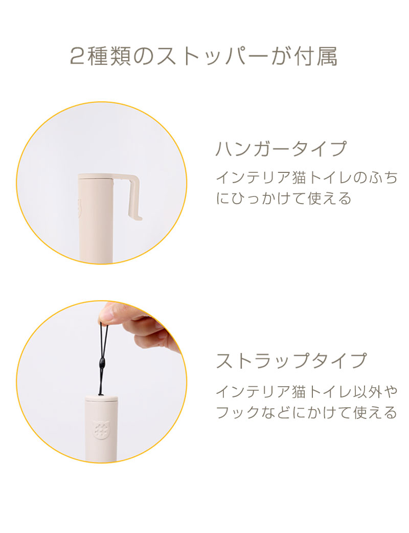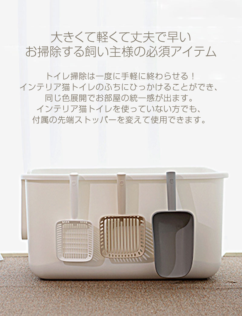 インテリア猫トイレの猫砂トイレスコップ。 穴あきスコップ(小)(大)と穴なしスコップの4タイプから選べます。 インテリア猫トイレ本体にひっかけて保管できるハンガーと フックなどにかけて保管できるパーツの2種類がついているので、 インテリア猫トイレを使用していない方でもお使いいただけます。