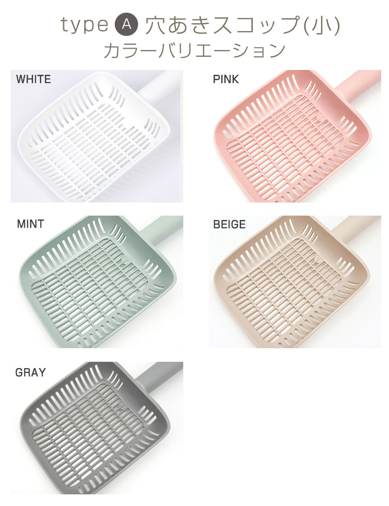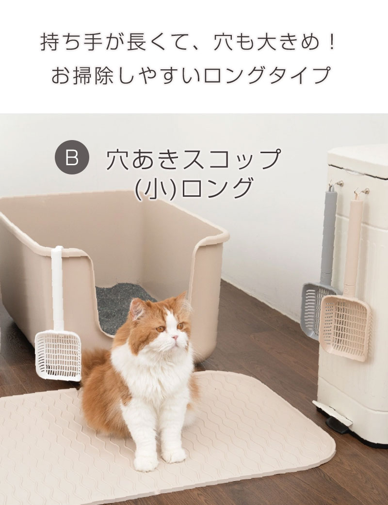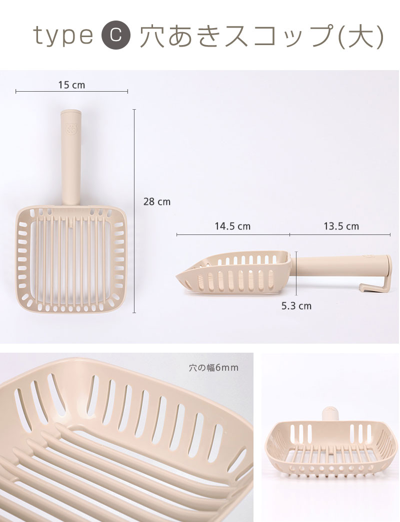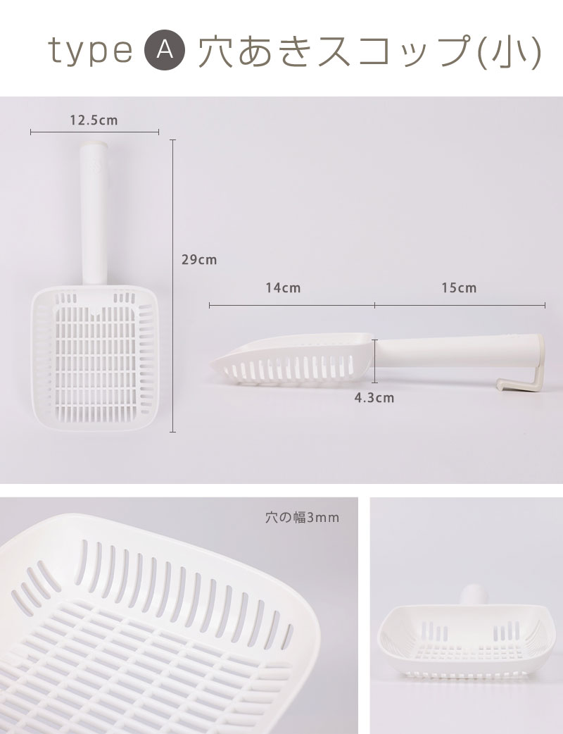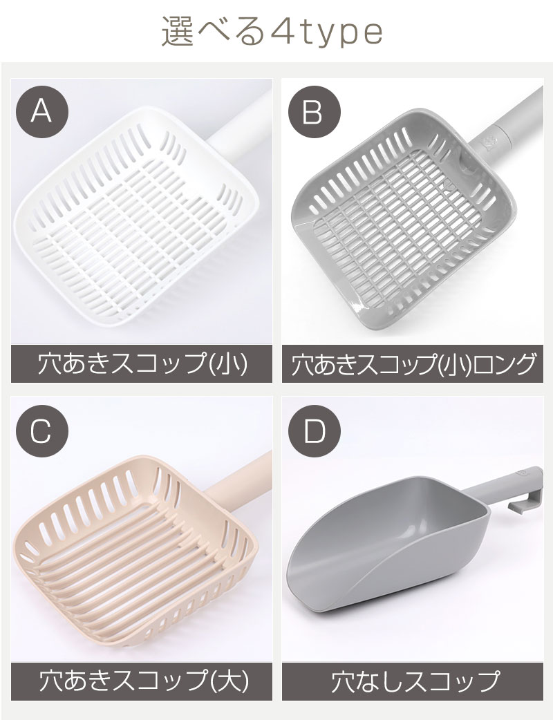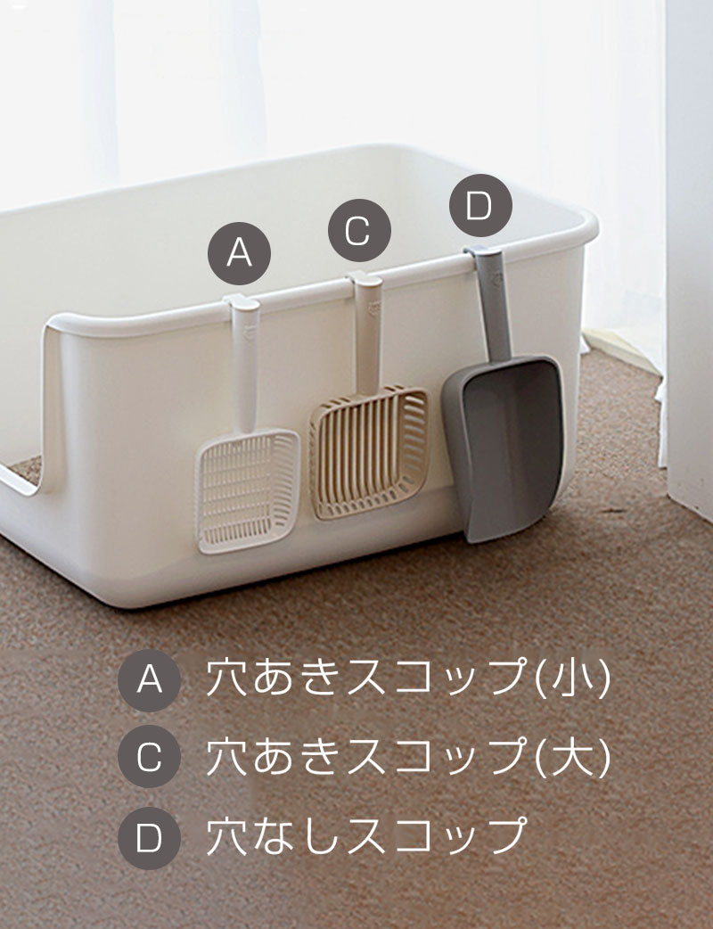品名:インテリア猫トイレ選べるスコップA:穴あきスコップ(小)B:穴あきスコップ(小)ロングC:穴あきスコップ(大)D:穴なしスコップ 素材:抗菌PP サイズ:A 長さ29cm 幅12.5cm 持ち手長さ15cm スコップの深さ4.3cm B 長さ34cm 幅11.5cm 持ち手長さ20.5cm スコップの深さ3.3cm C 長さ28cm 幅15cm 持ち手長さ13.5cm スコップの深さ5.3cm D 長さ34cm 幅13.7cm 持ち手長さ12.5cm スコップの深さ7.8cm 生産国:韓国