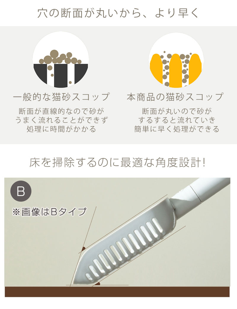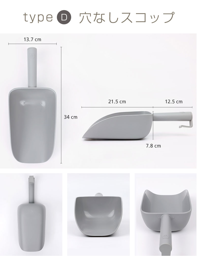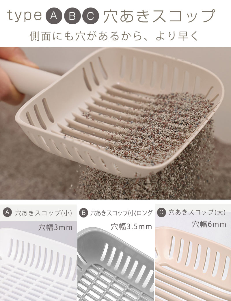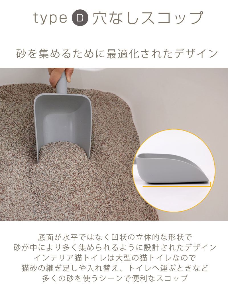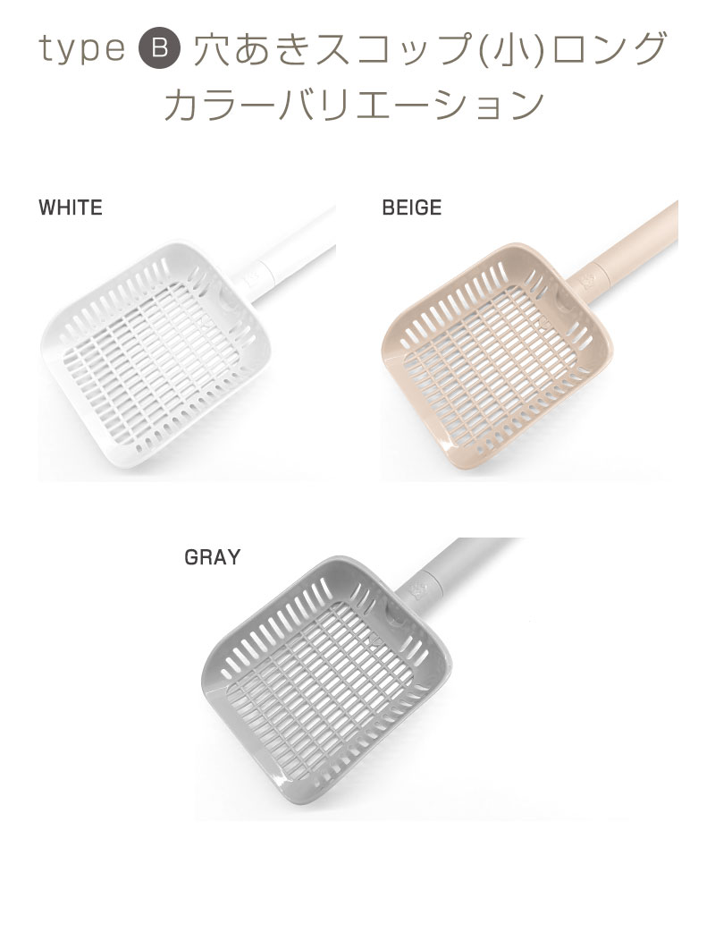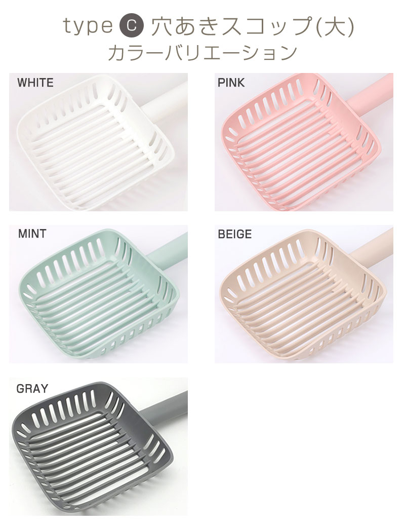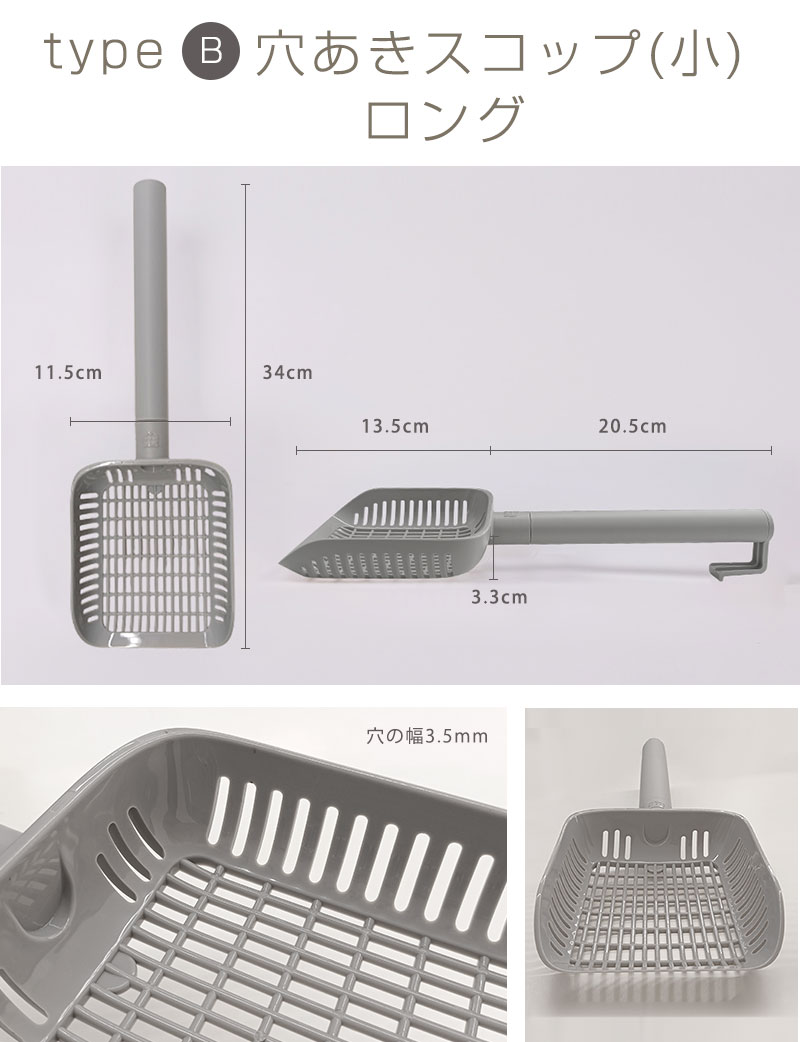 品名:インテリア猫トイレ選べるスコップA:穴あきスコップ(小)B:穴あきスコップ(小)ロングC:穴あきスコップ(大)D:穴なしスコップ 素材:抗菌PP サイズ:A 長さ29cm 幅12.5cm 持ち手長さ15cm スコップの深さ4.3cm B 長さ34cm 幅11.5cm 持ち手長さ20.5cm スコップの深さ3.3cm C 長さ28cm 幅15cm 持ち手長さ13.5cm スコップの深さ5.3cm D 長さ34cm 幅13.7cm 持ち手長さ12.5cm スコップの深さ7.8cm 生産国:韓国