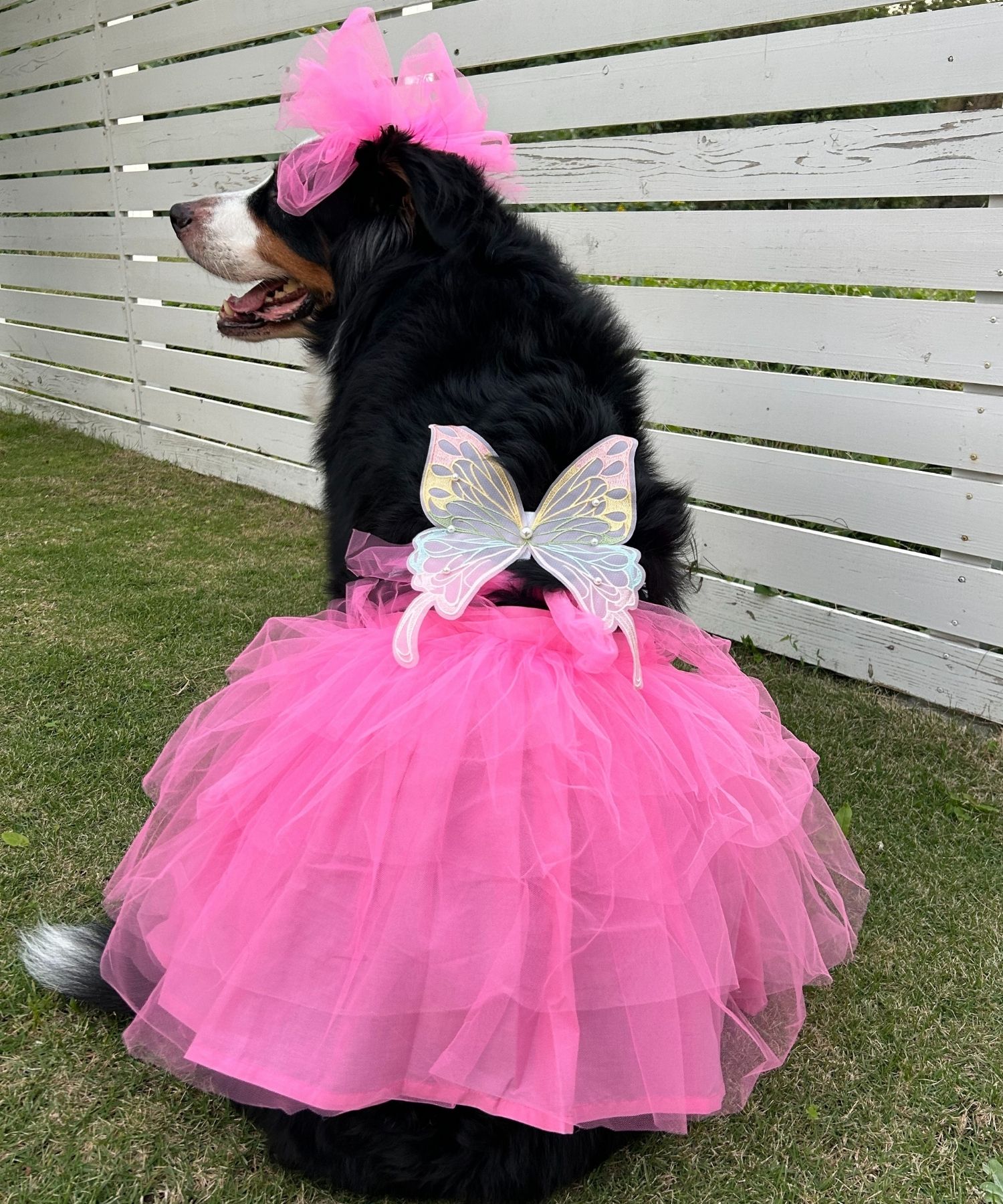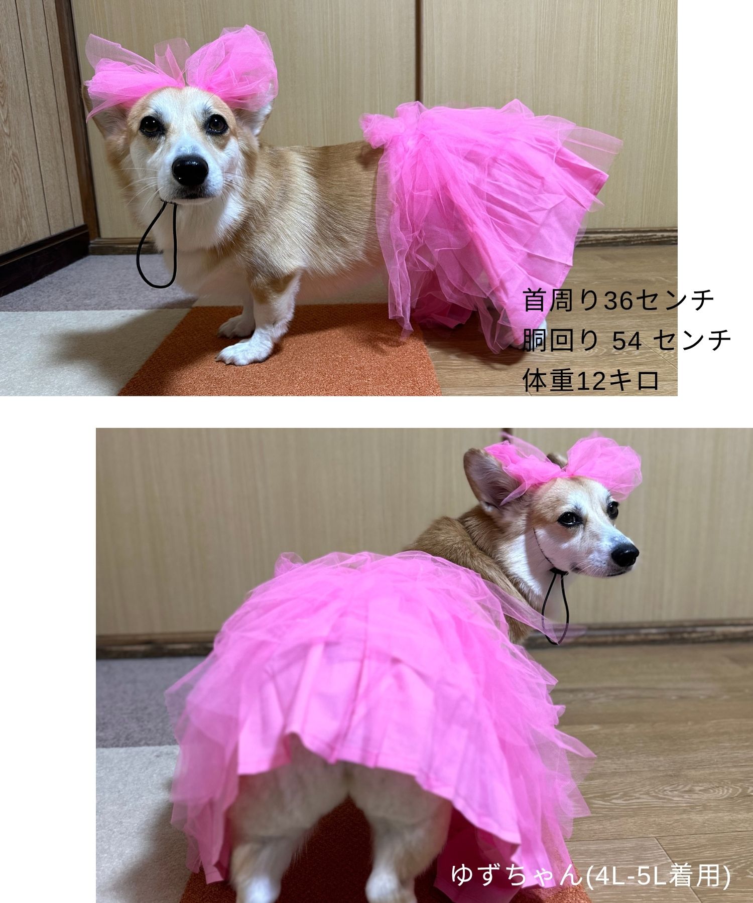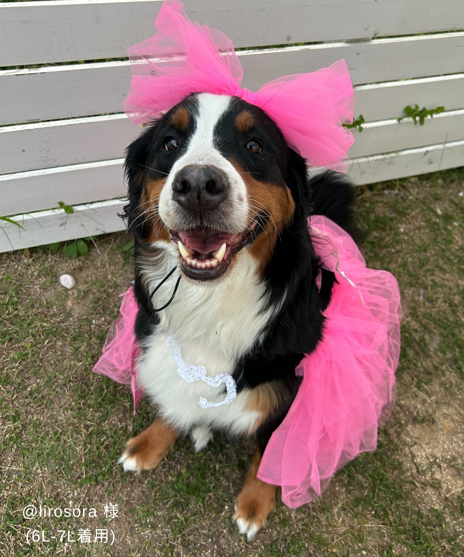 たっぷりふわふわ5段フリルのチュチュスカートとお揃いのリボンセット。セットで使えばパーティー気分。短毛種のおねこさまおいぬさまでも安心なチクチクしないふわふわソフトチュール素材を使用し、たっぷりボリュームがかわいいスカートです。巻きスカート型でサイズ調節がカンタンで、どんなおいぬさまおねこさまでもぴったりジャストサイズに。お持ちのペット服と重ね着できる1年中おしゃれが楽しめるペット服です。