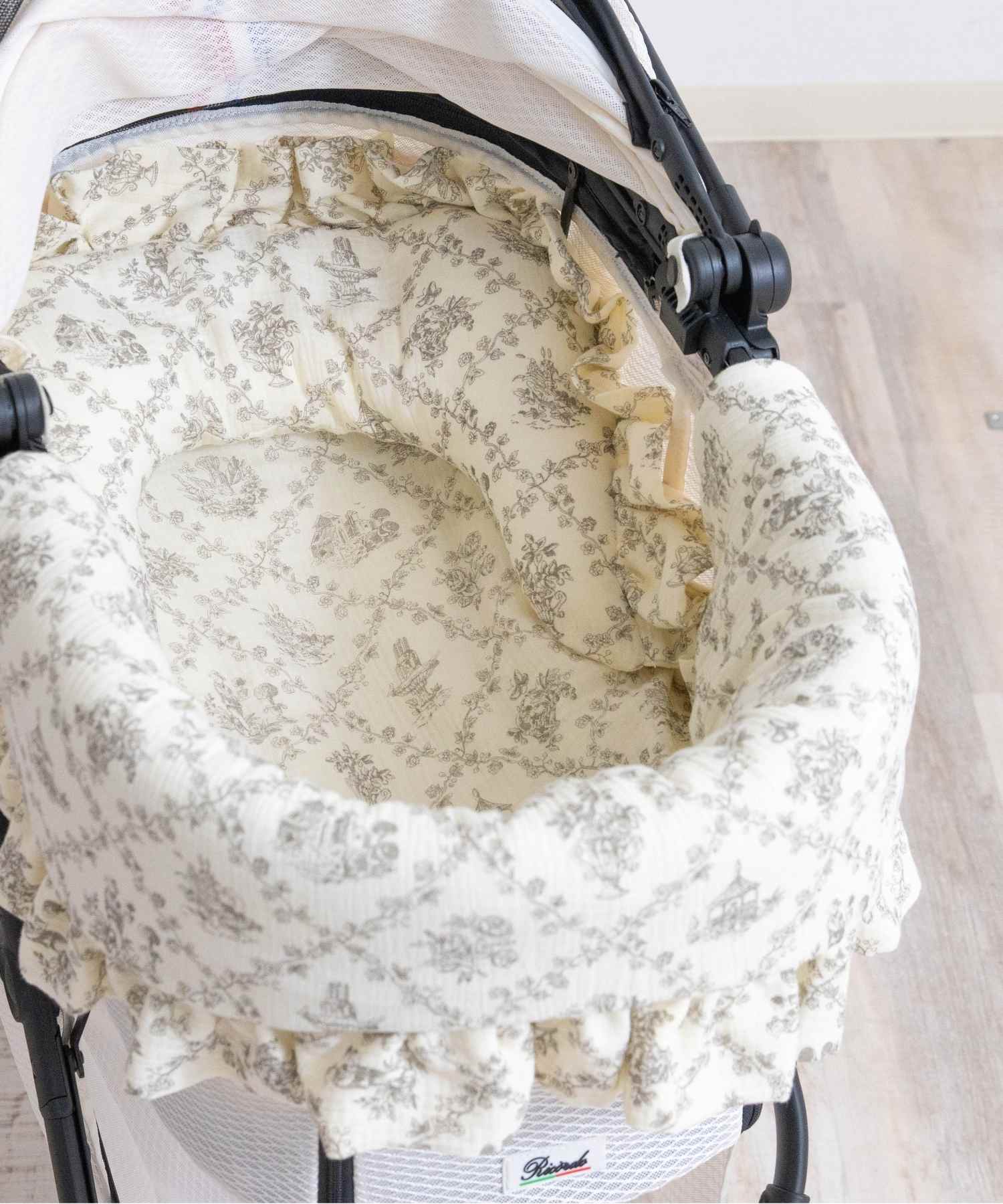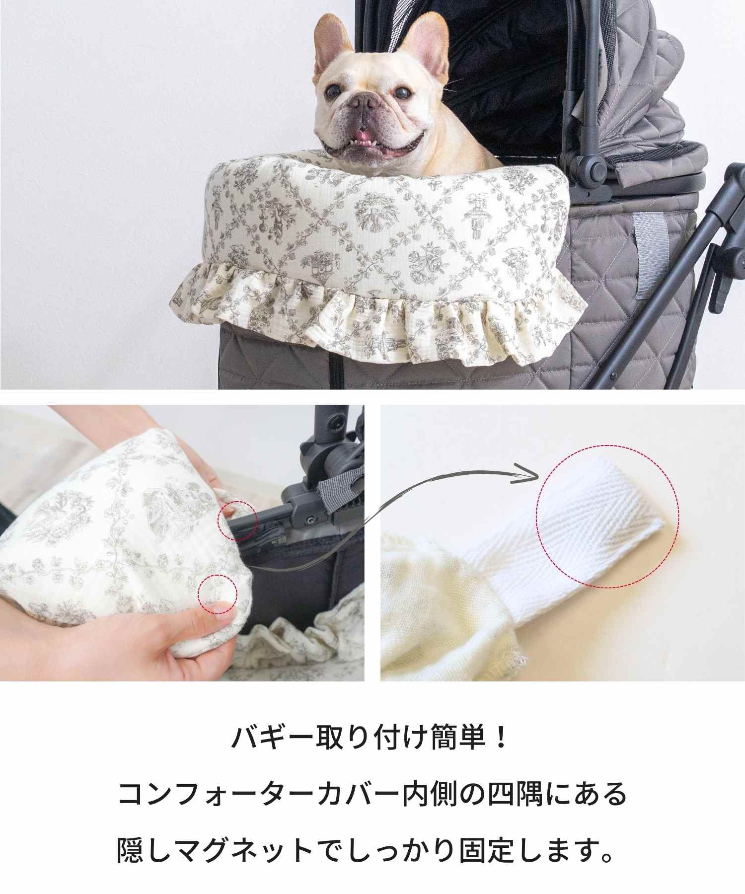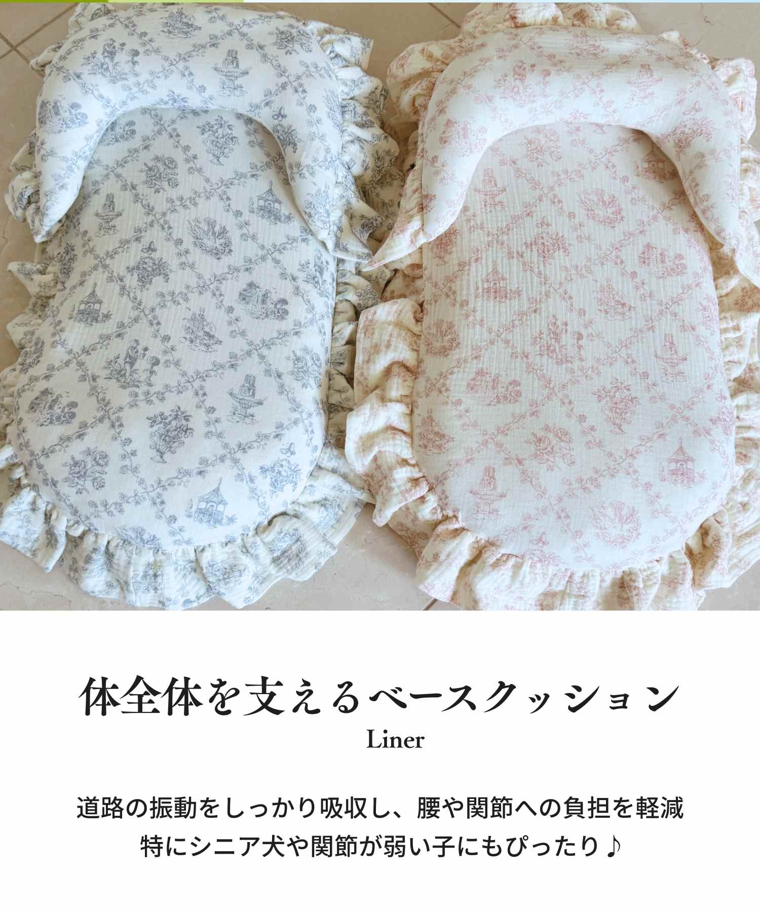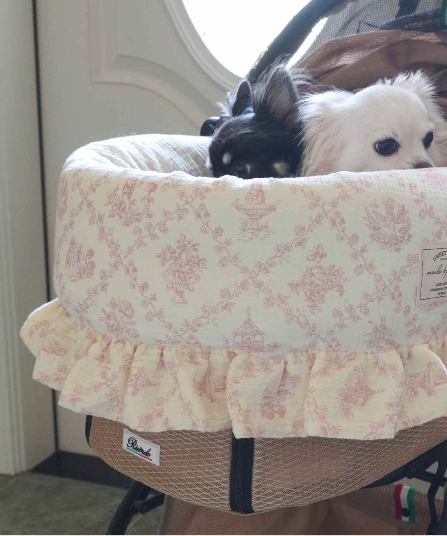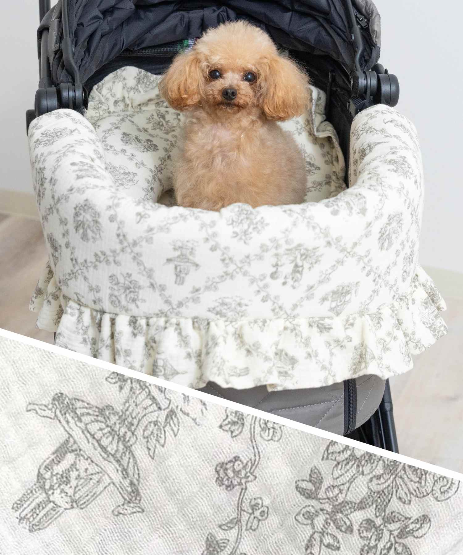 可愛らしいトワルドジュイ柄でカートが華やかに♪ フリル付きクッションでお出かけがもっと楽しくなる、ペットカート用カバーです。 約7cmのふっくら厚みでワンちゃんもリラックス。 取り外してベッドとして旅行先やおうちでも活躍します。 カバー・クッションとも丸洗いOKの安心マルチユースアイテムです。