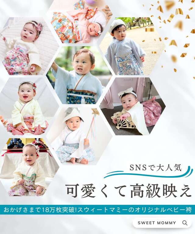 七五三やお正月、ハーフバースデーやお披露目など、様々なシーンで活躍するマタニティウェアと授乳服の通信販売スウィートマミーおすすめの袴風カバーオール。華やかなベビーウェアは好印象間違いなし!着せやすさも、優しさもベビーーの事を1番に考えました。