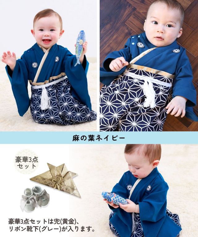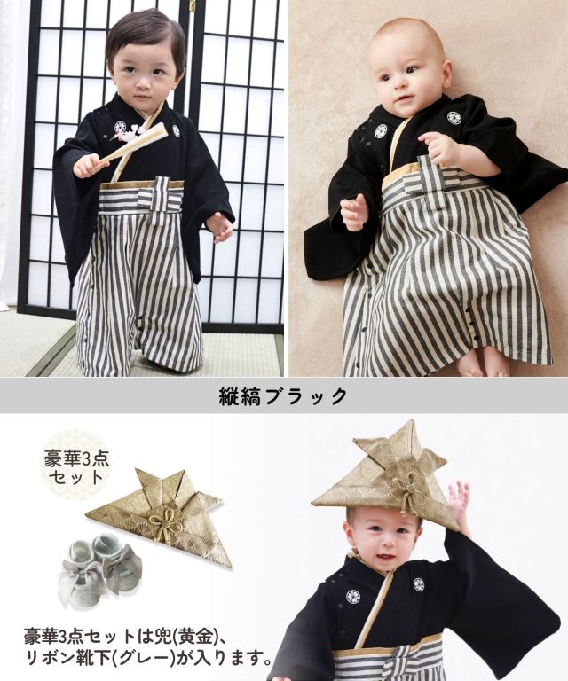 縦縞ブラック/鯉アイボリー/麻の葉ネイビー/竹ネイビー 袴単品 6,980円(税込) 豪華セット 8,990円(税込)