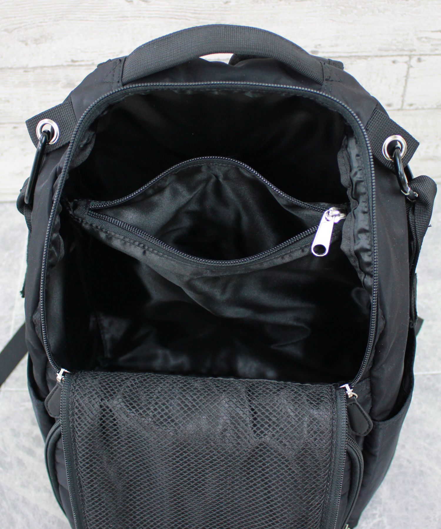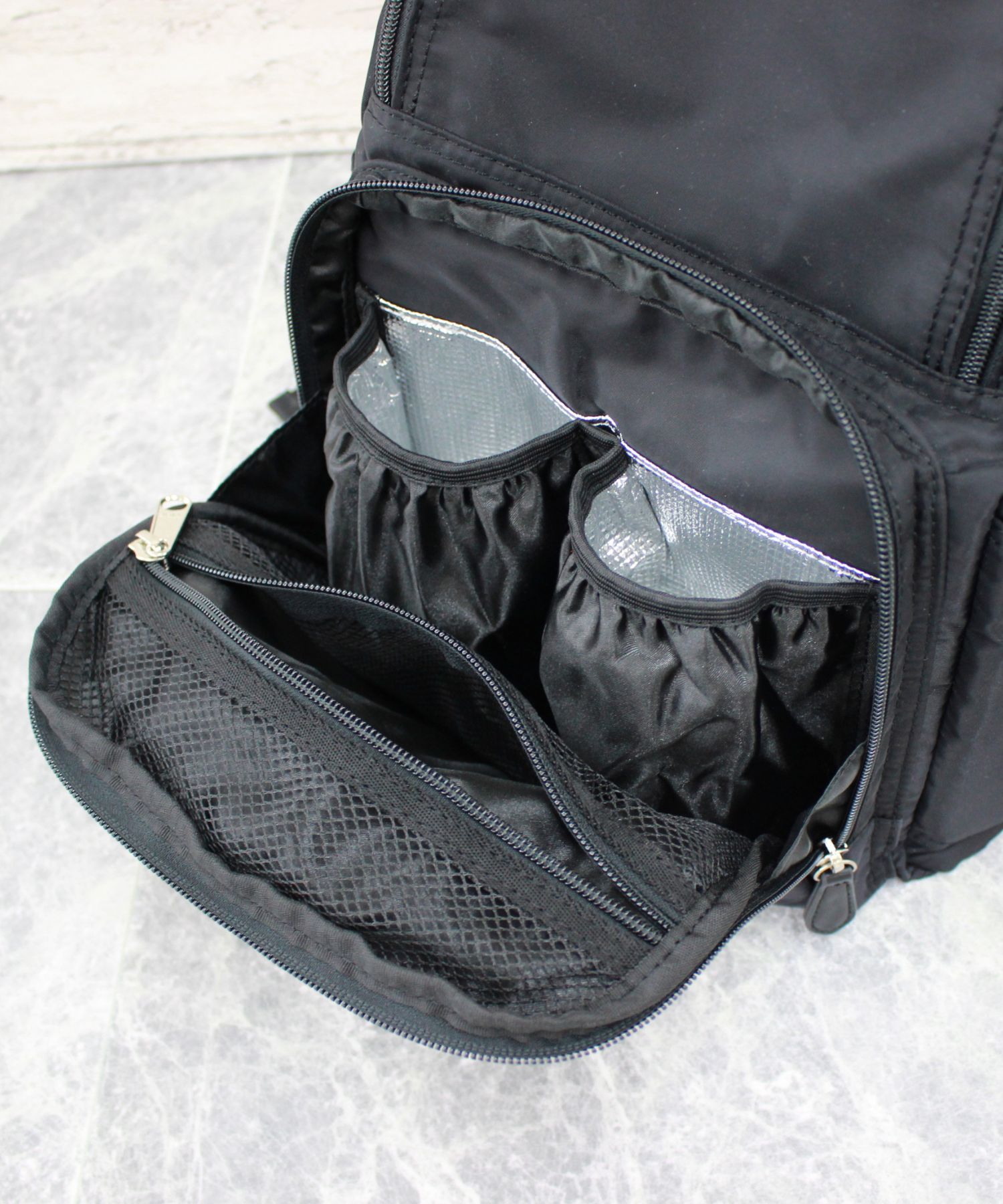 背中ファスナーがついておりリュックを降ろさなくても中身が取り出せて快適。ベビーカーフック付きで、おでかけ中もママの負担が減りストレスフリーです。