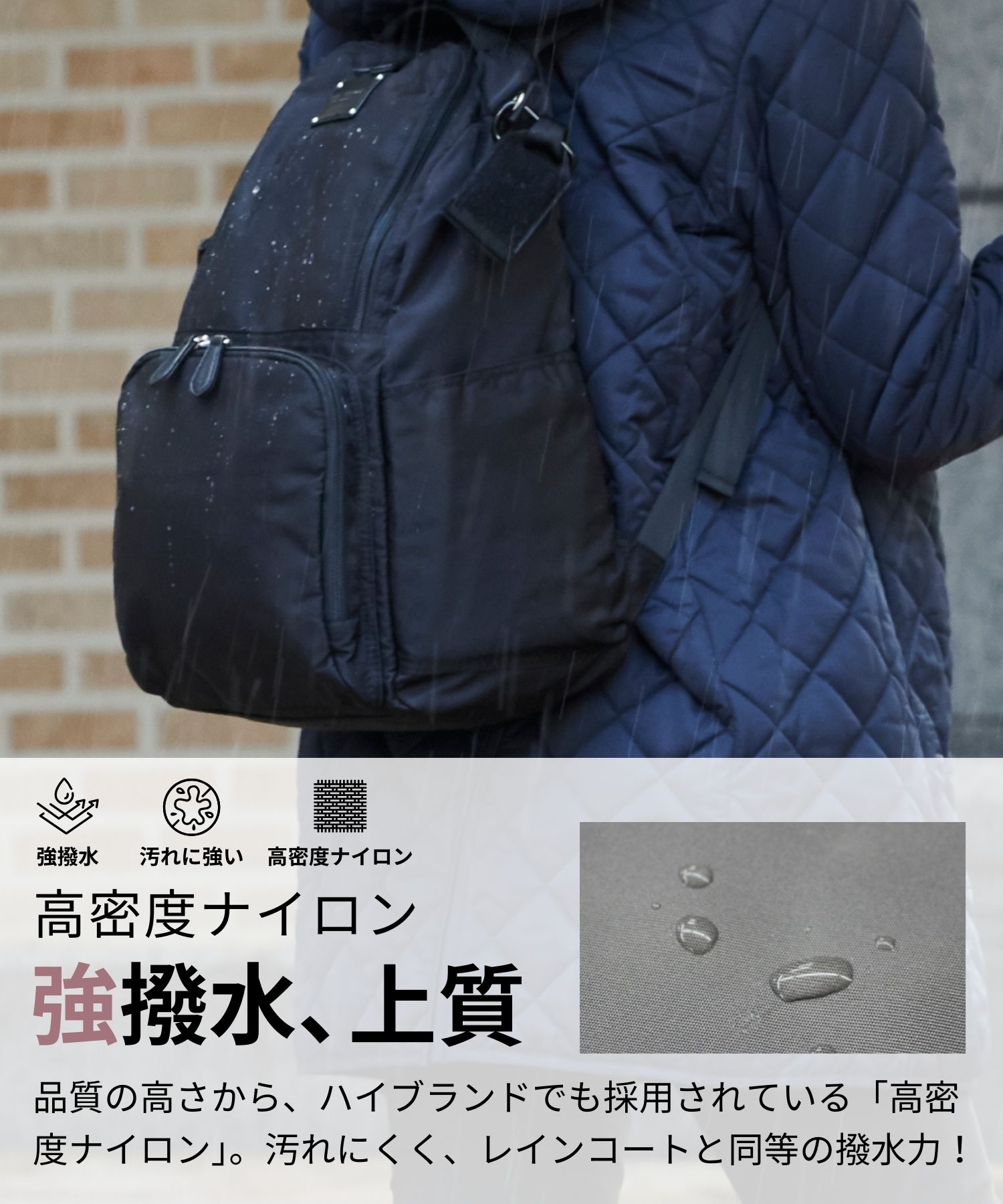強撥水ナイロンは、レインコート級の撥水力で丈夫で汚れに強くお手入れが楽なのが特徴です。