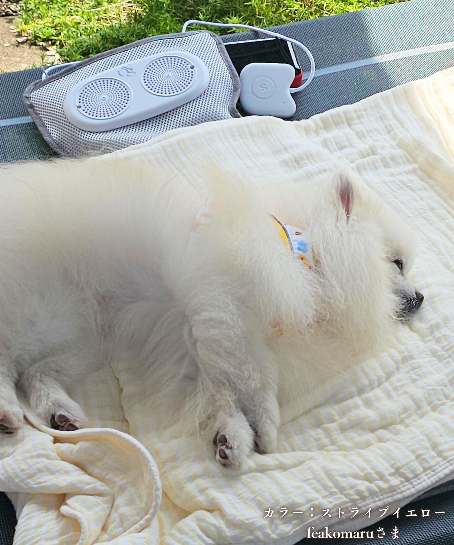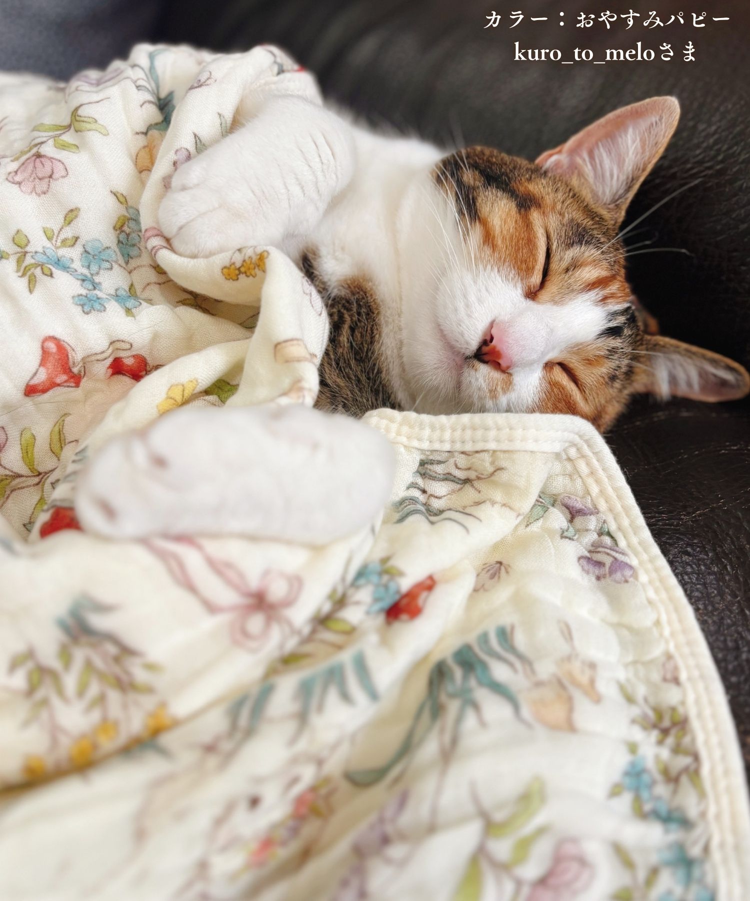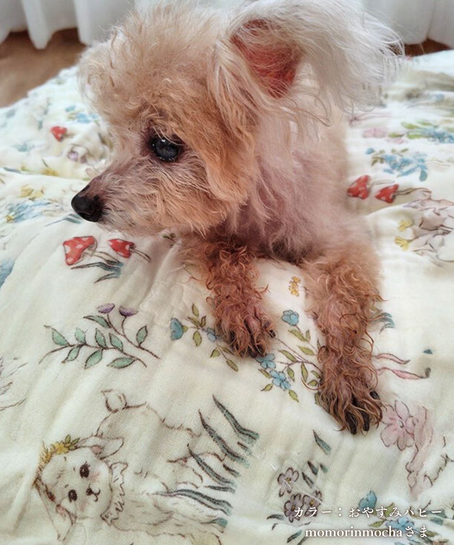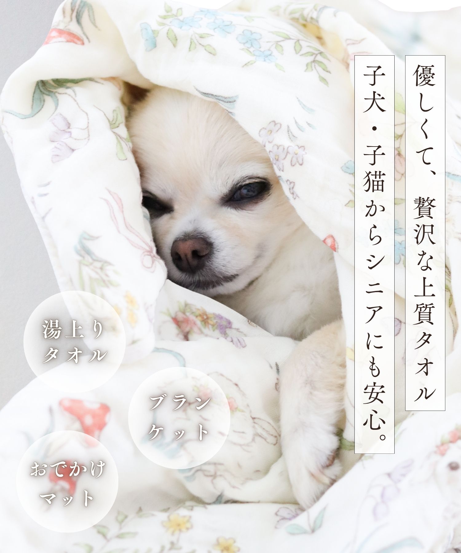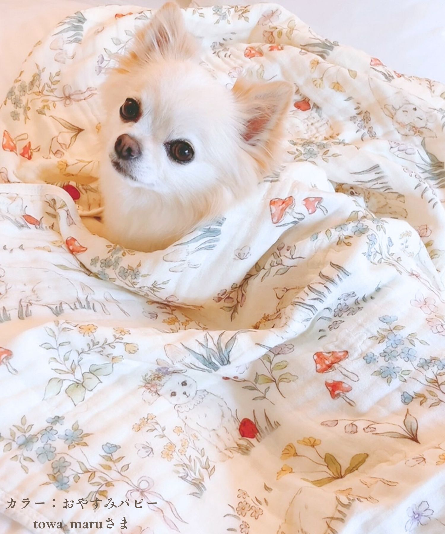 触り心地はもちろん 清潔感ある素材の香りと、 使っていてほっこりするイラストが 最高に可愛いです!! 大判なので使い勝手もよく、 畳んだらカフェマットのように 冷えてきたら愛犬を包んであげられたり、おうちだけでなくお出かけでも大活躍です!