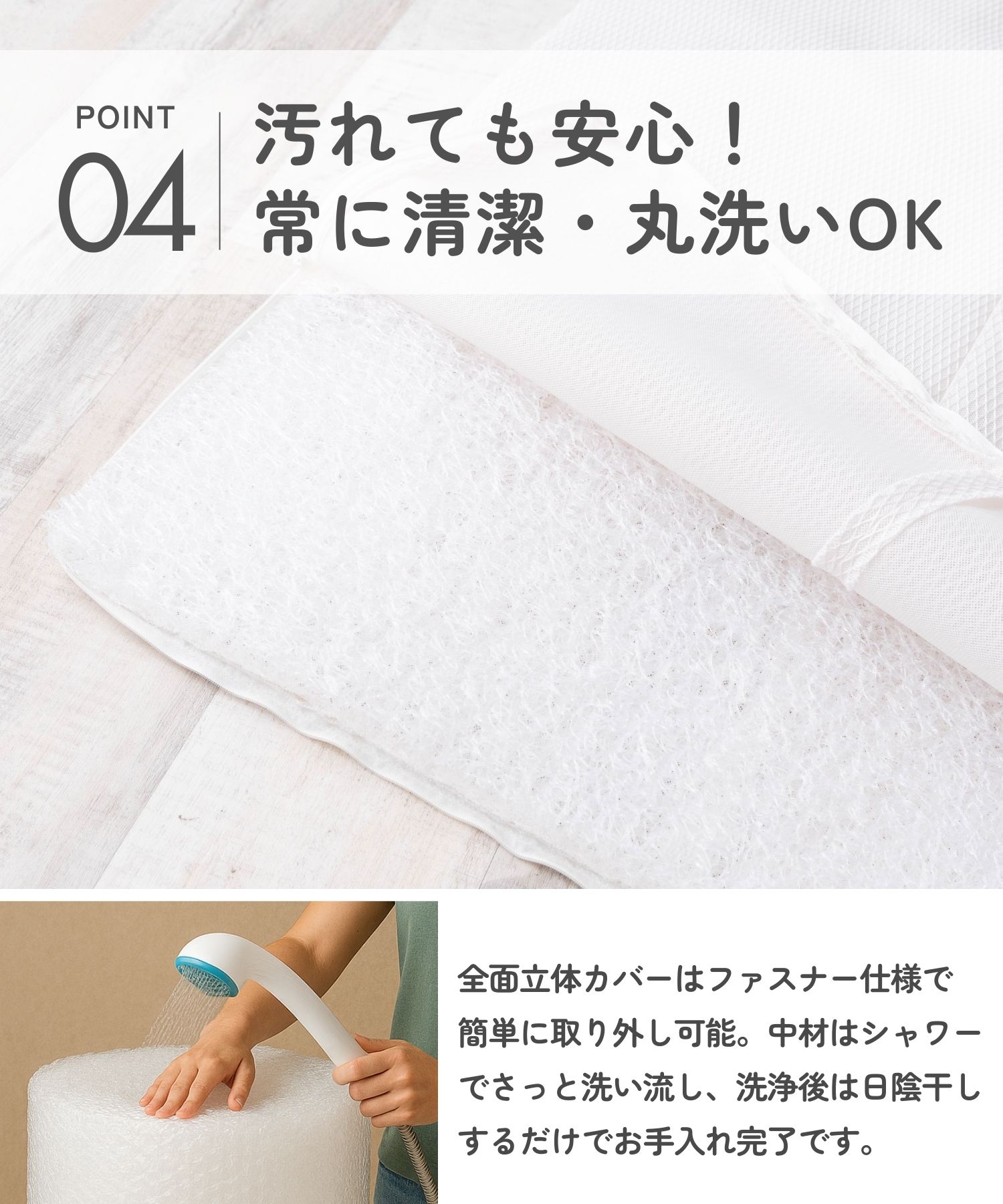 カバーも中材も丸ごと水洗いできるので、いつでも清潔に保てます。